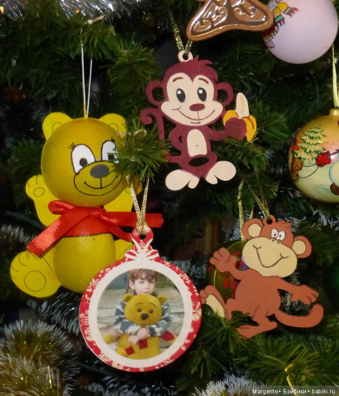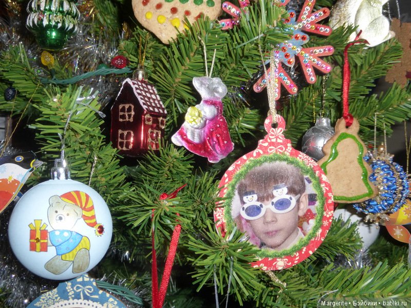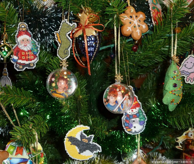 Здесь тоже чего только нет: вышивка на пластиковой канве, фетровая елочка, пряничная снежинка и фотографии сыновей в пластиковых шариках :)