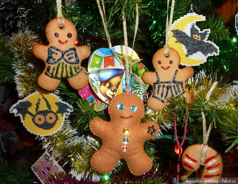 Здесь солируют пряничные человечки, причем как настоящие пряничные, так и фетровый :) А еще в кадр попал шарик из открыток (учила детей делать игрушки «как в моем детстве») и пара вышитых на пластиковой канве…