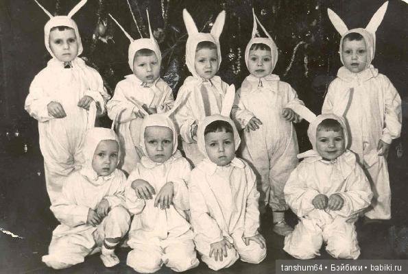 Совершенно суперская тема-это мальчики-зайчики! Чего стоило накрахмалить и поставить ушки, чтобы они не висели, как у кролика! Это целые технологии, нанотехнологии тут бессильны:)) В тканевые ушки вставлялся картон, или же тонкий каркас из проволоки, и потом самым немыслимым образом всё это закреплялось к основе ушек-шапочке-чепчику или же к ободочку. Зато какой был драйв, когда 10-15 зайчат выскакивали к ёлке!