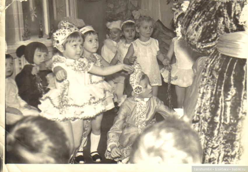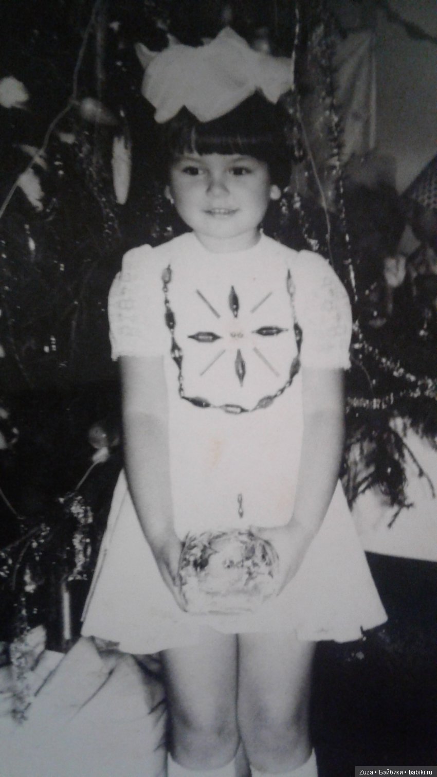 А это я. Лет6, наверное. Отлично помню картонную корону, обклееную ватой и украшенную бусинами как на платье. Почему я с бантом, не знаю.