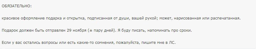 И потом, в письме же просто написано, что 29-го необходимо отправить подарок и прислать трек организатору. А когда организатор будет просматривать треки, не сказано)