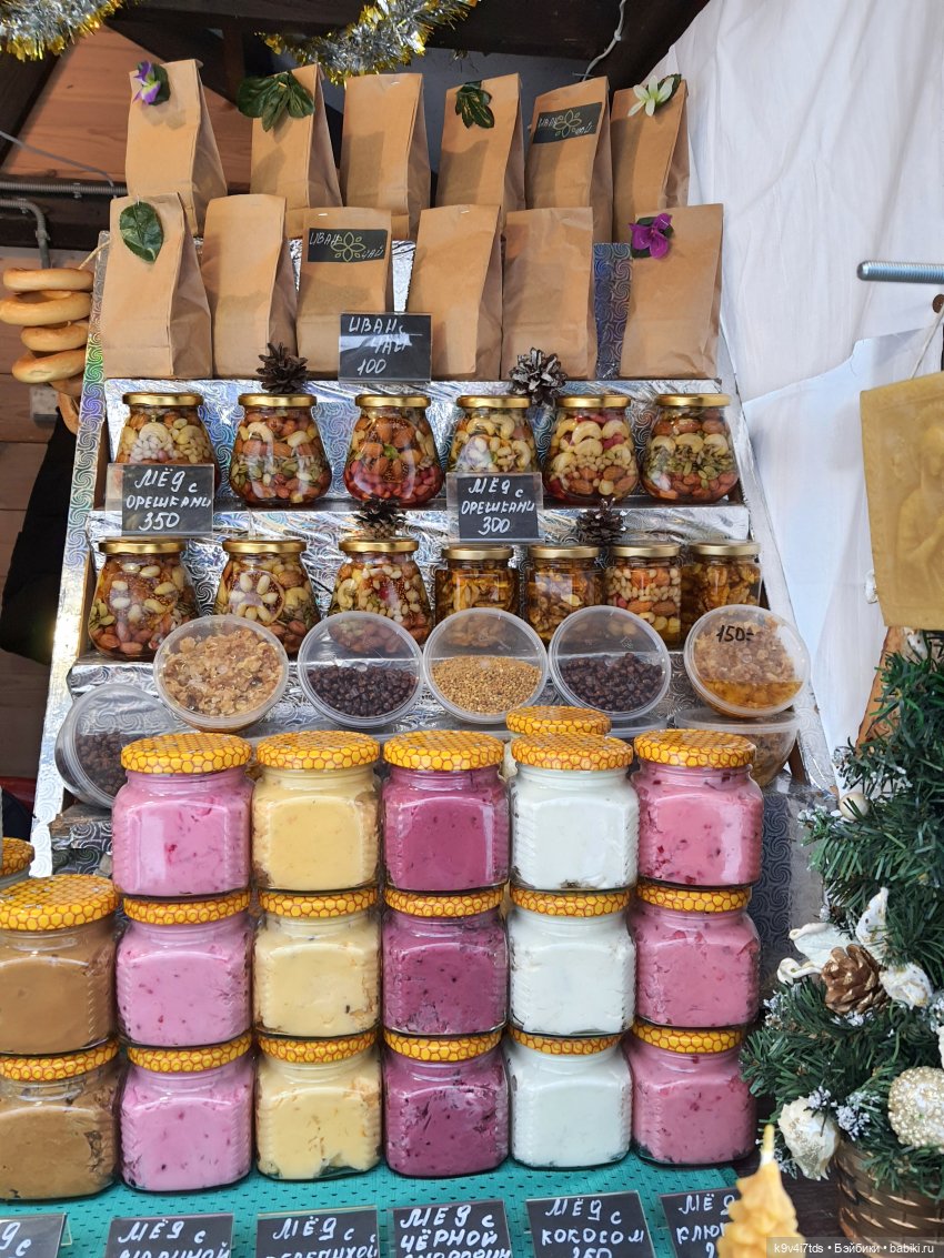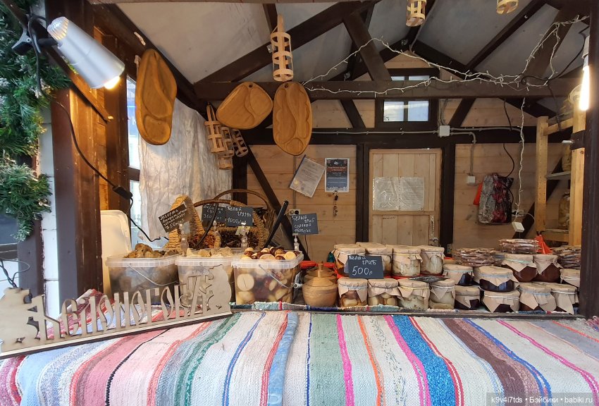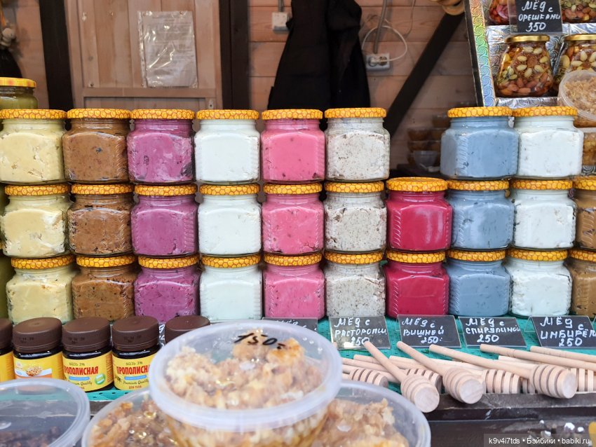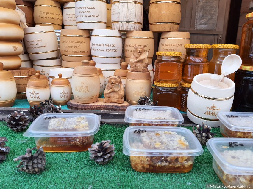Самое красивое оформление, на мой взгляд, это «Медовая лавка». Бочонки как в старину, в таких ещё раньше продавалось Вологодское сливочное масло.