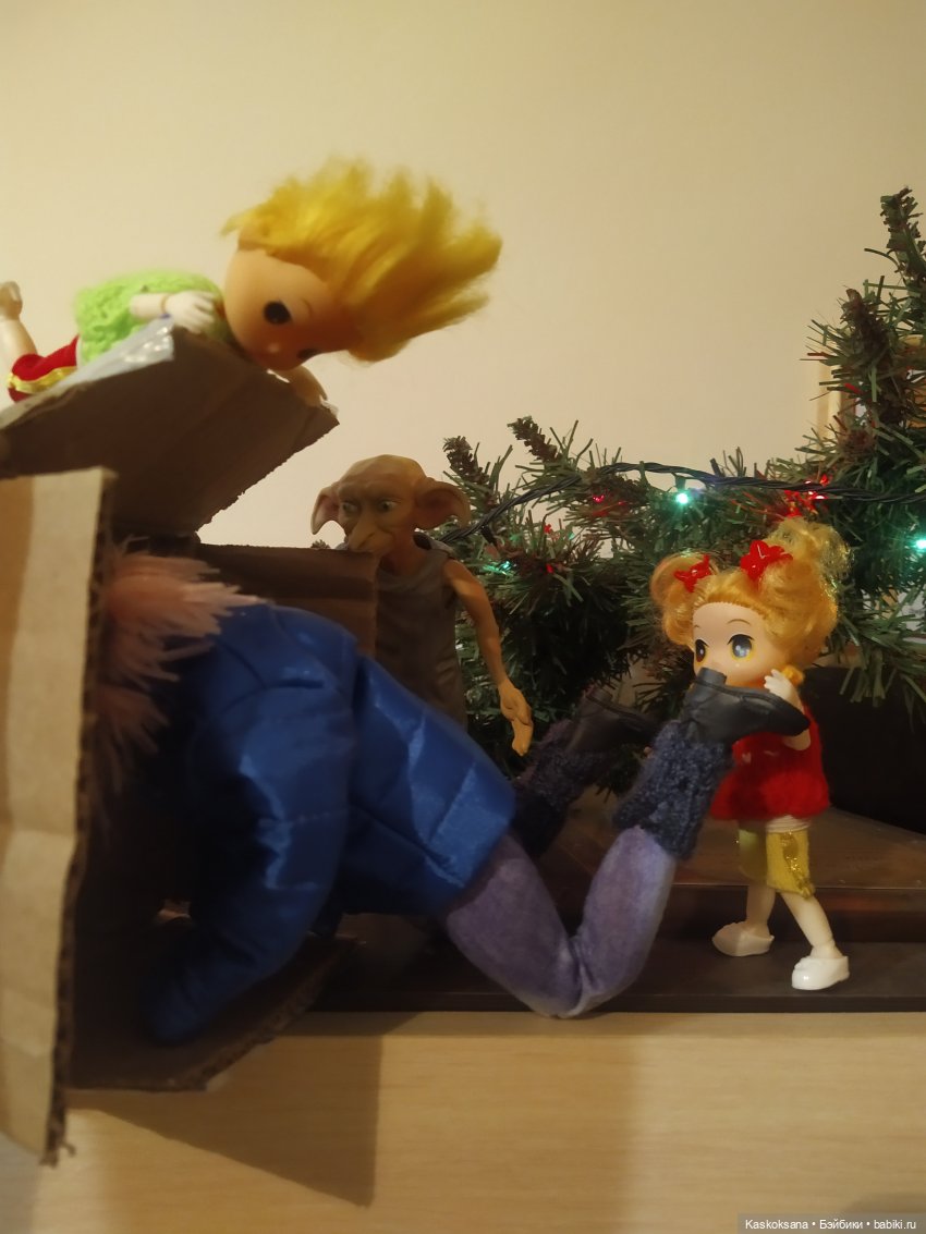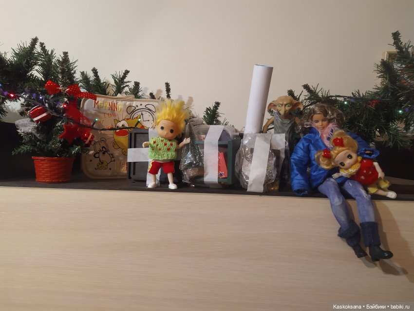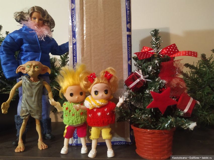 На почту Долли со мной ходила, ну и говорит, я открывать буду. А тут Добб прискакал с елкой, мол под елкой открывать будем. Ну а без Любимчиков как?