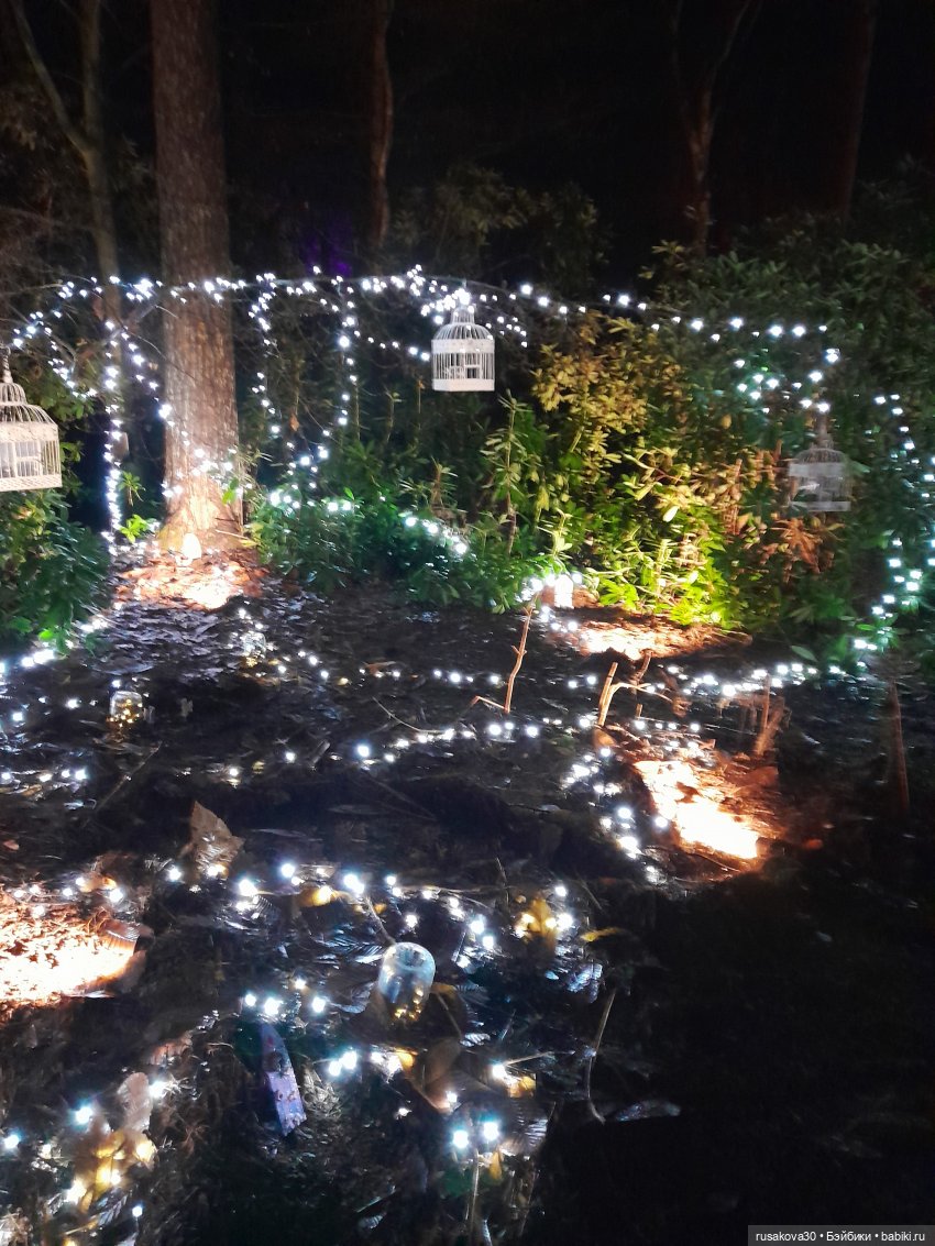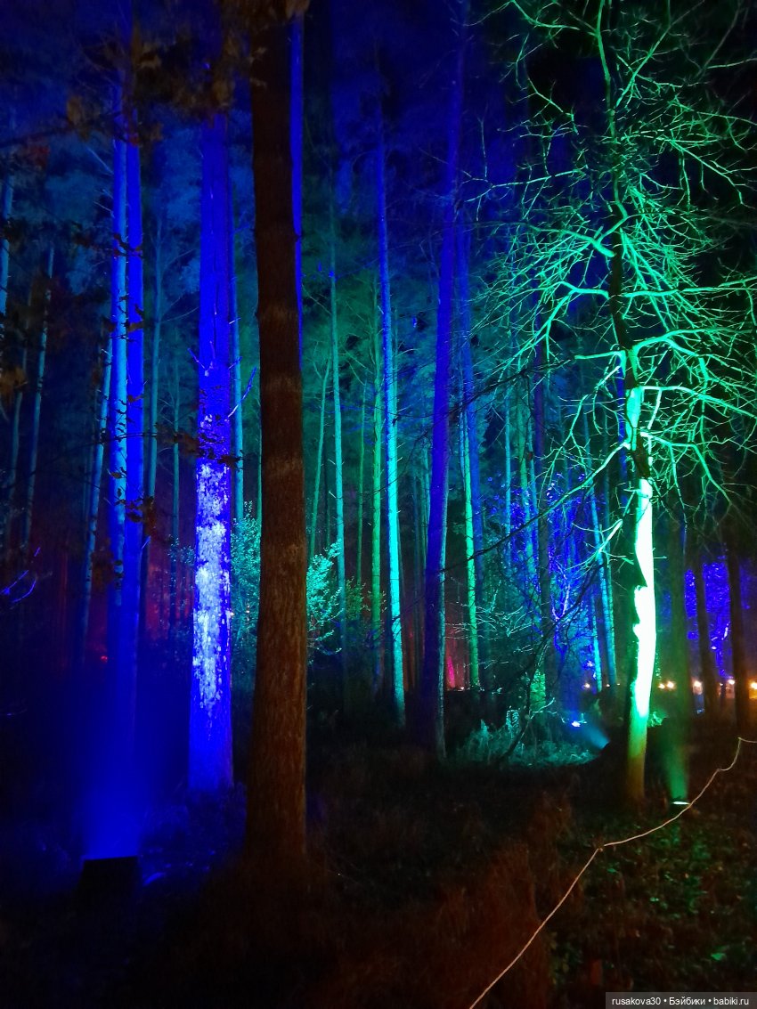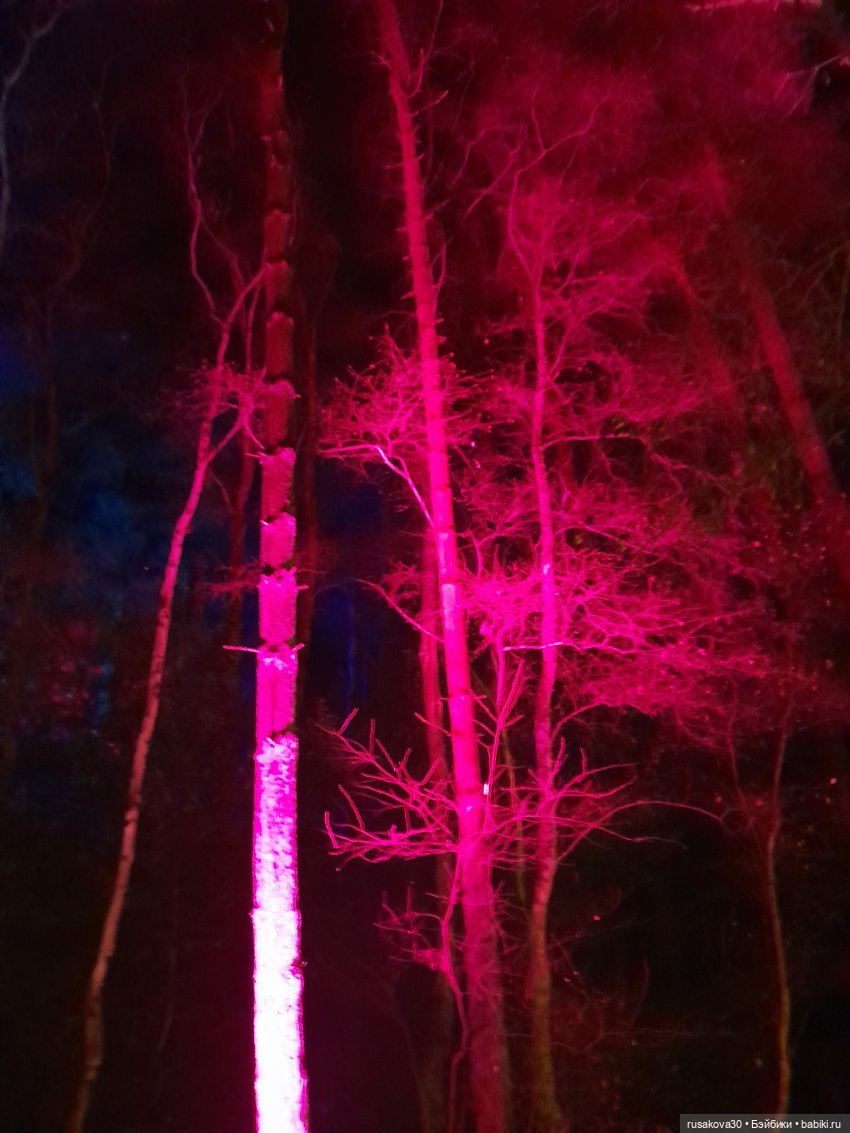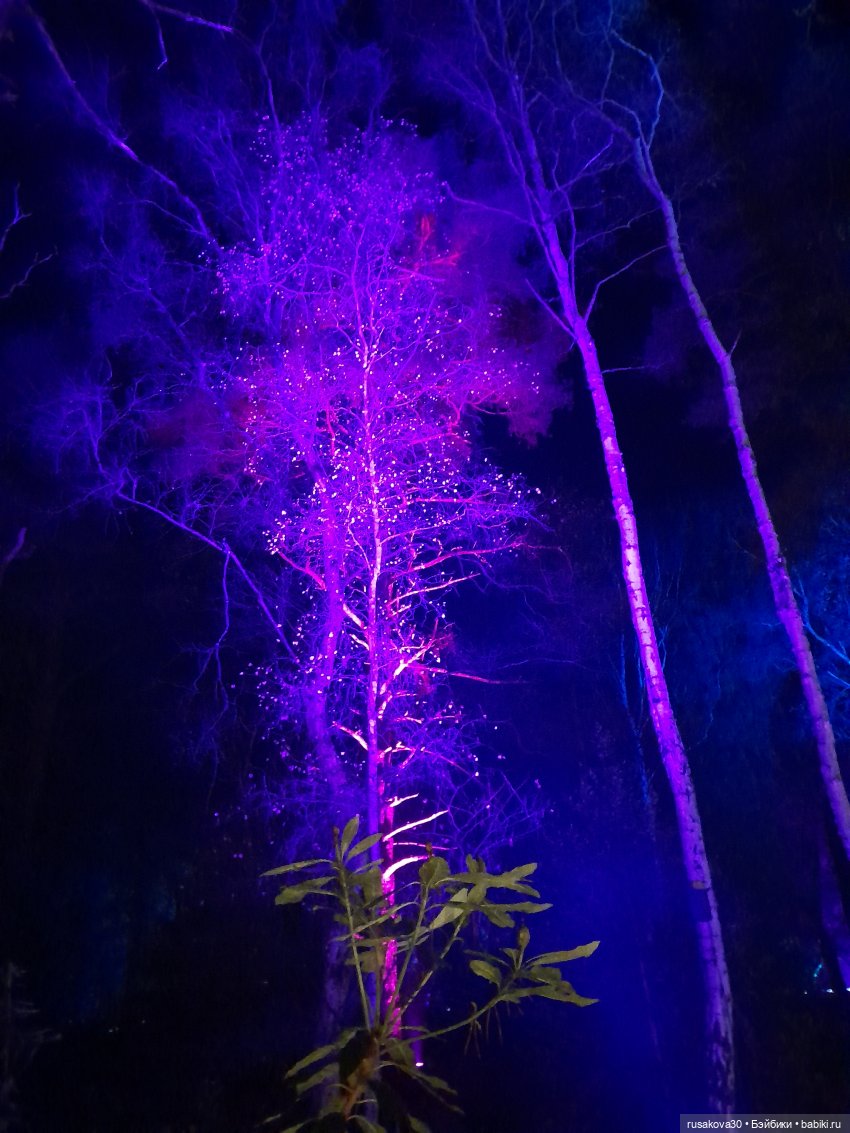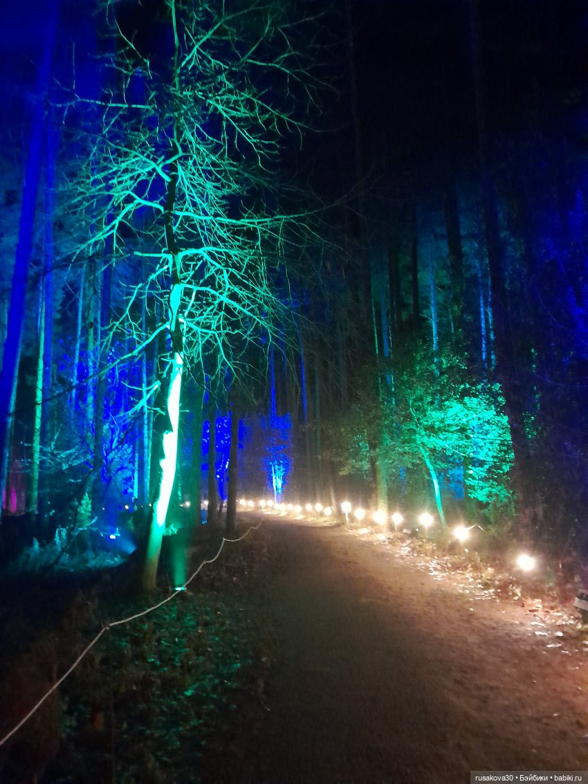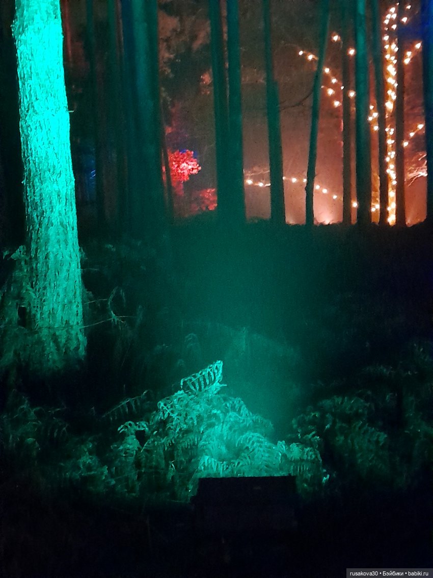 В лесу тихо играла музыка, была шикарная подсветка кустов и деревьев.