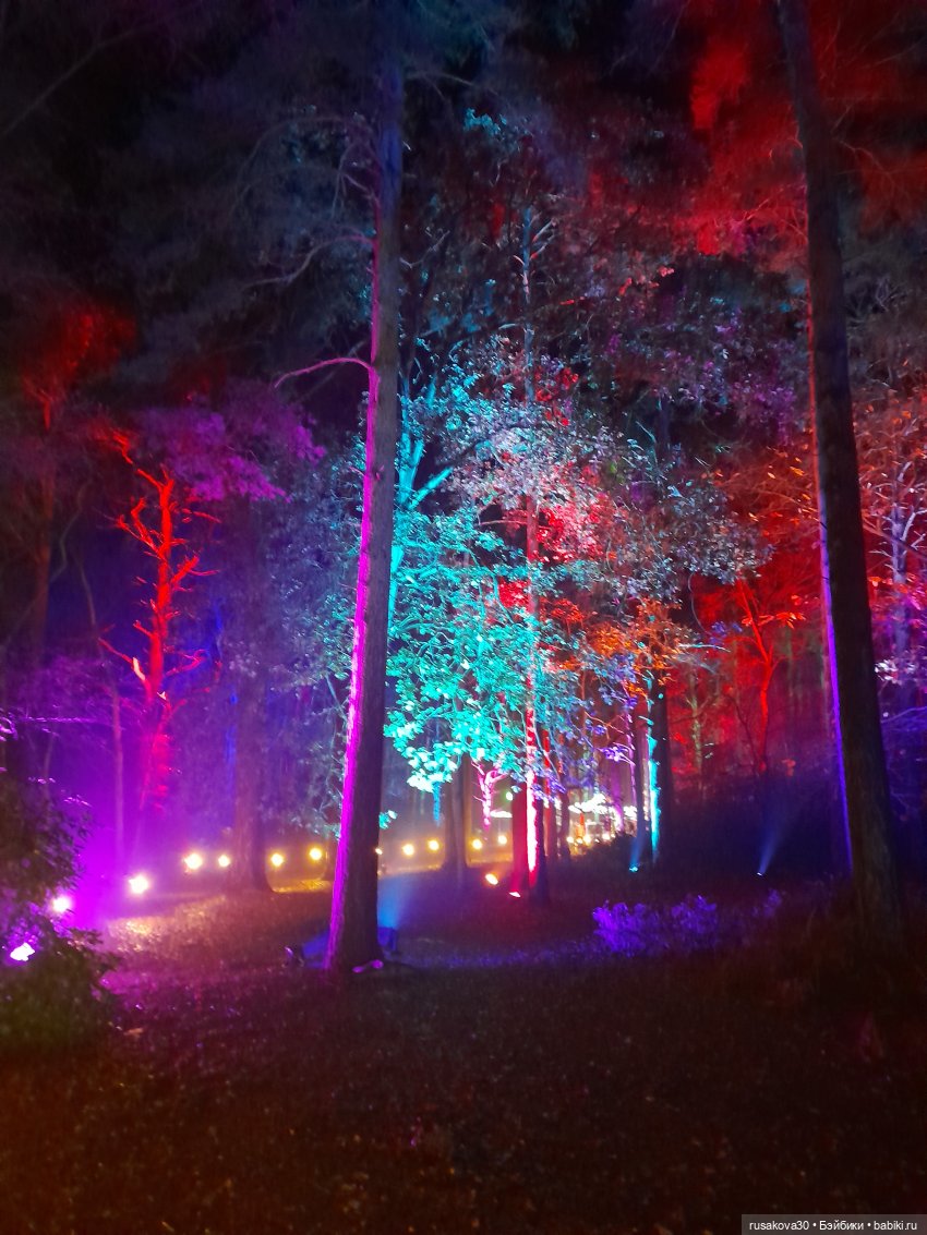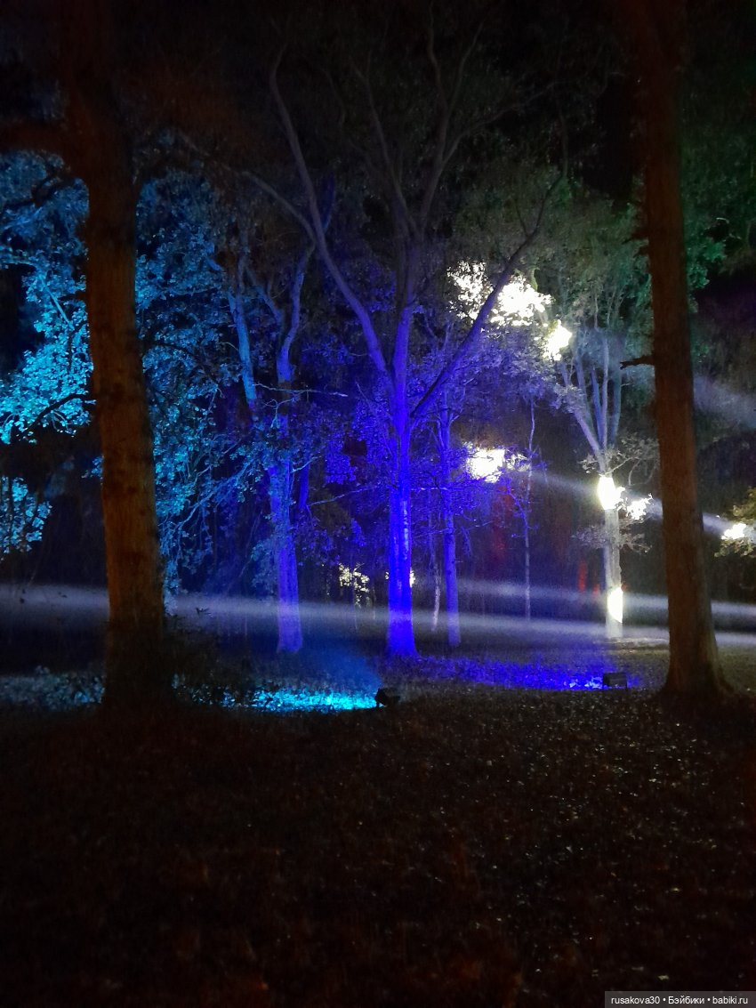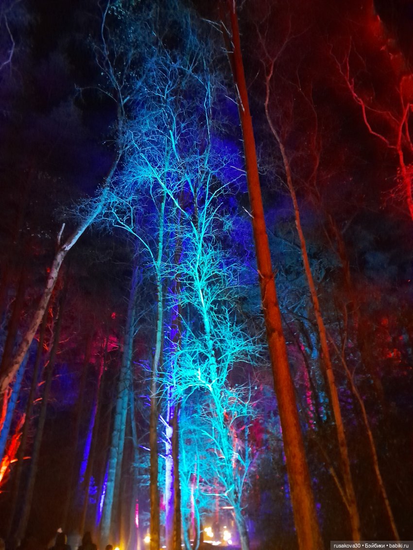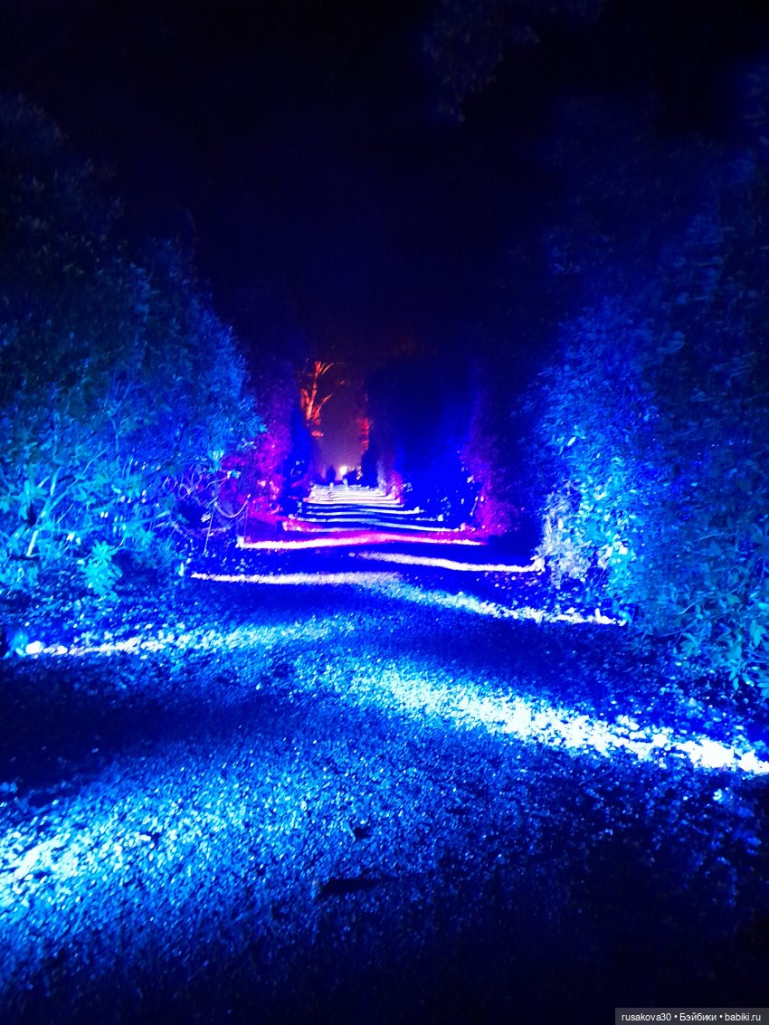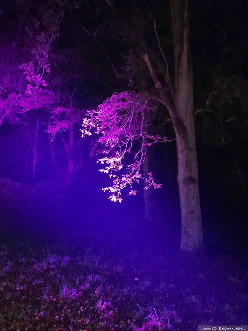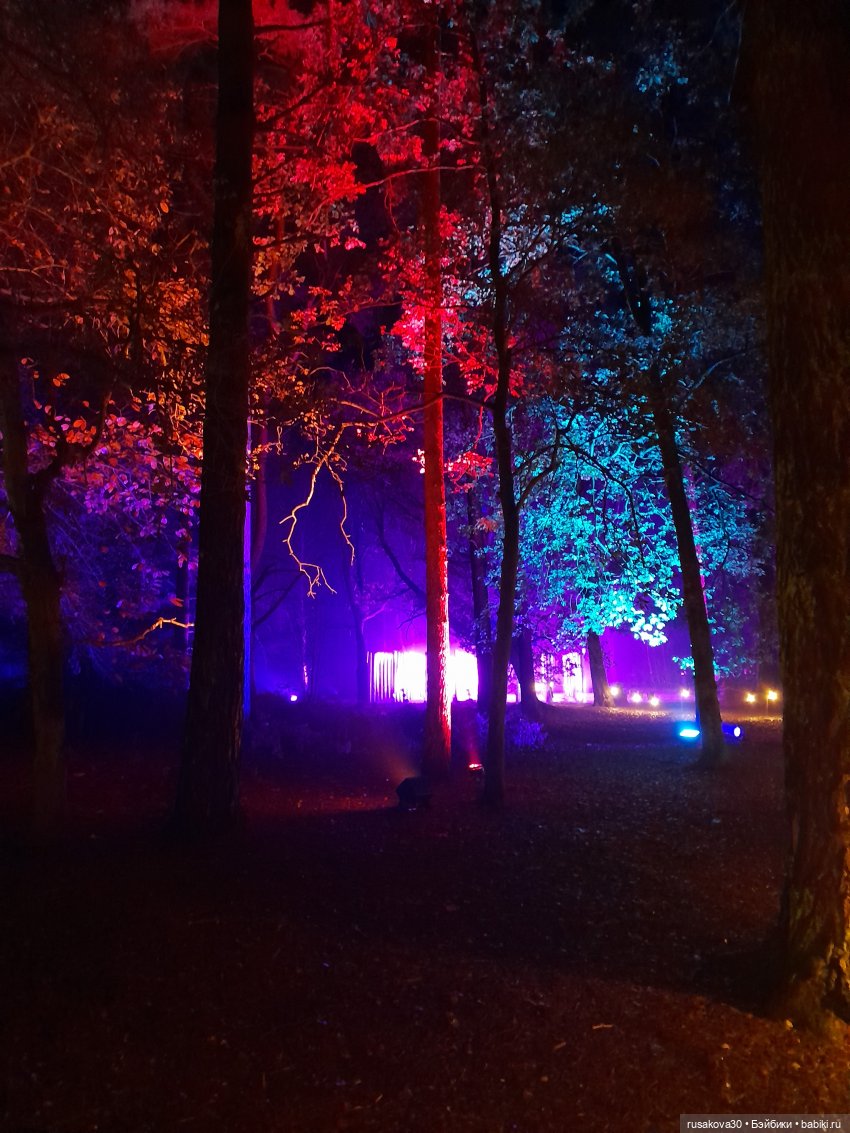 В лесу тихо играла музыка, была шикарная подсветка кустов и деревьев.