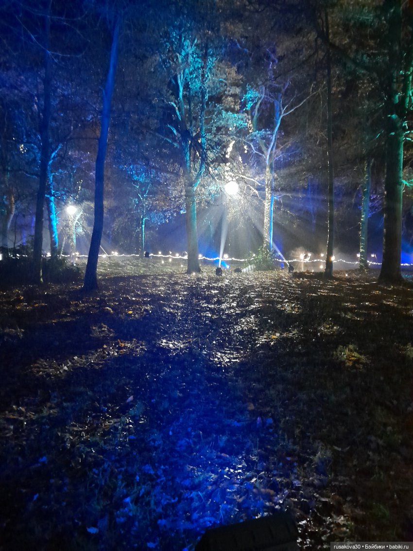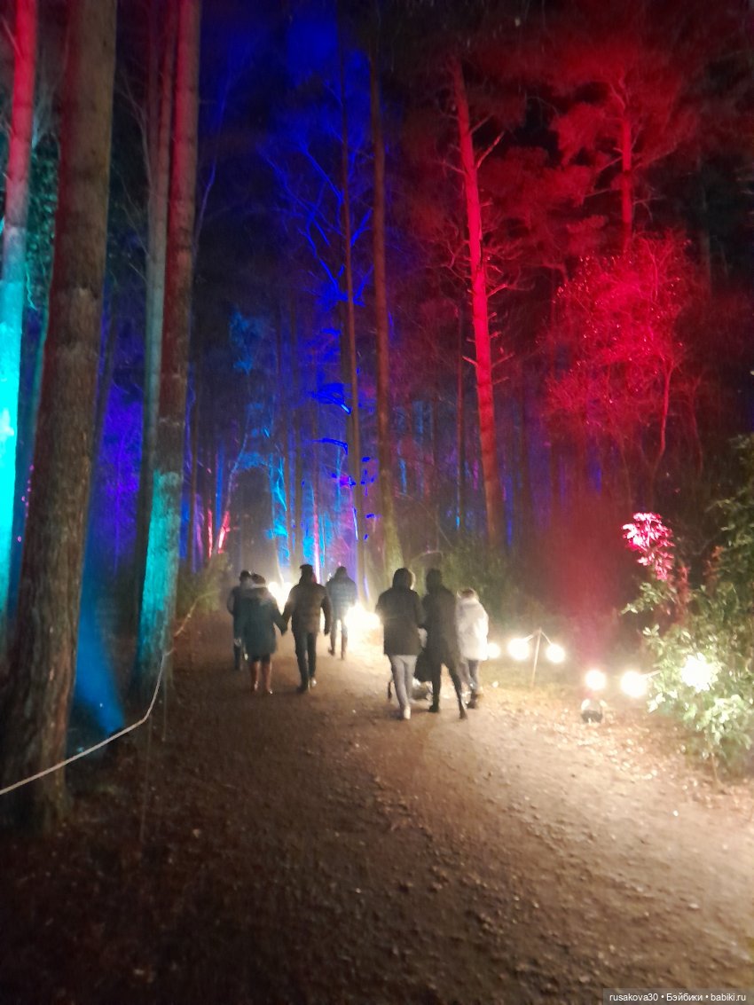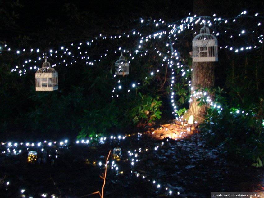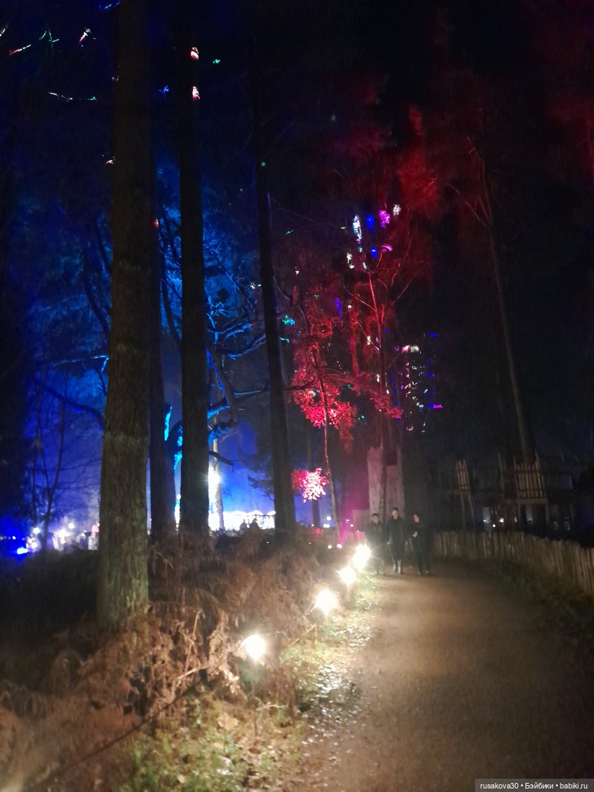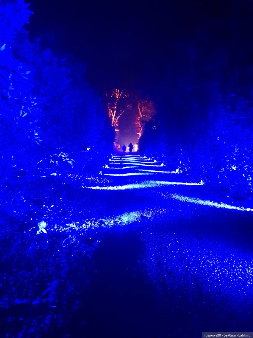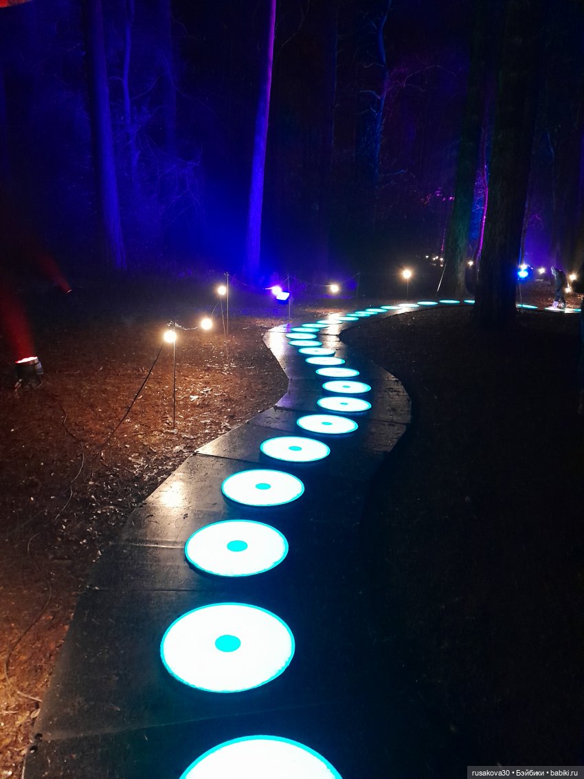 В лесу тихо играла музыка, была шикарная подсветка кустов и деревьев.
