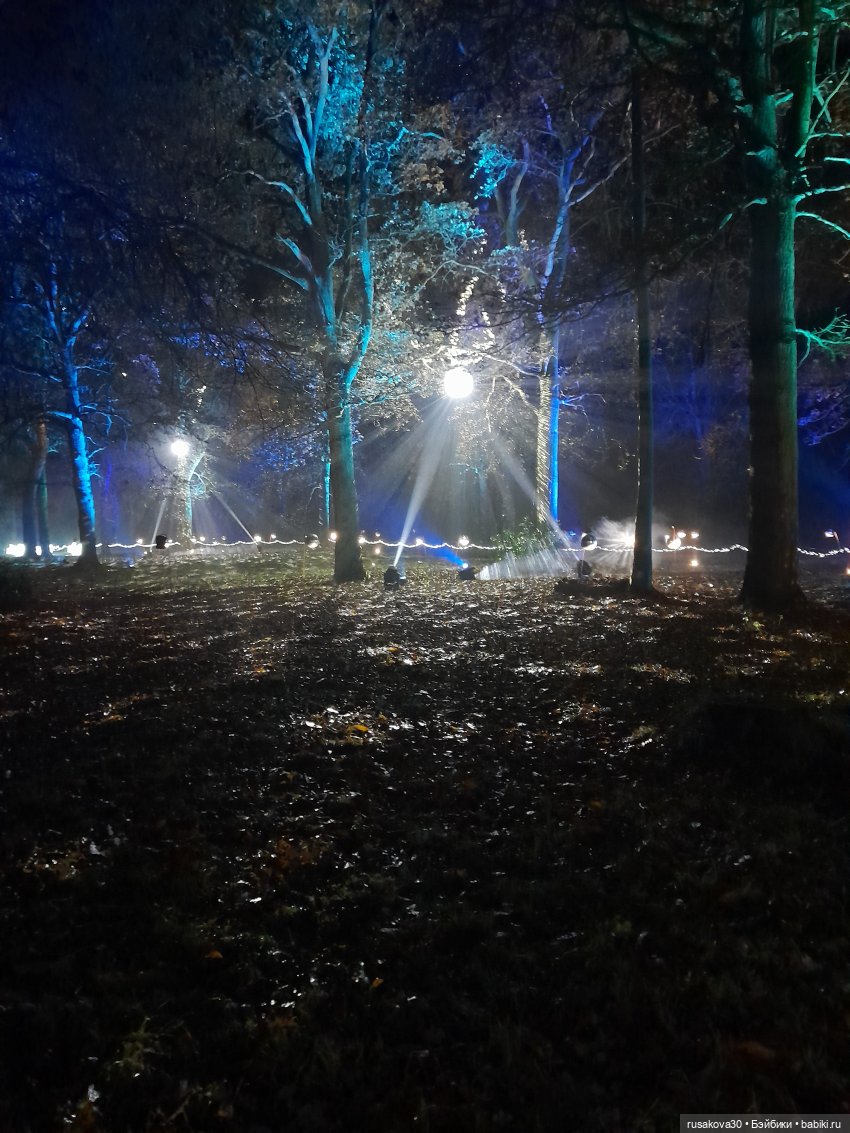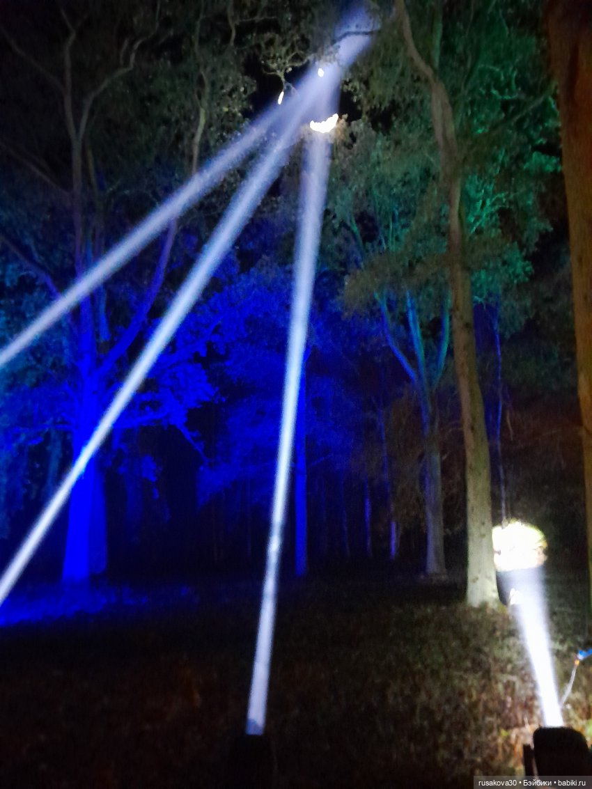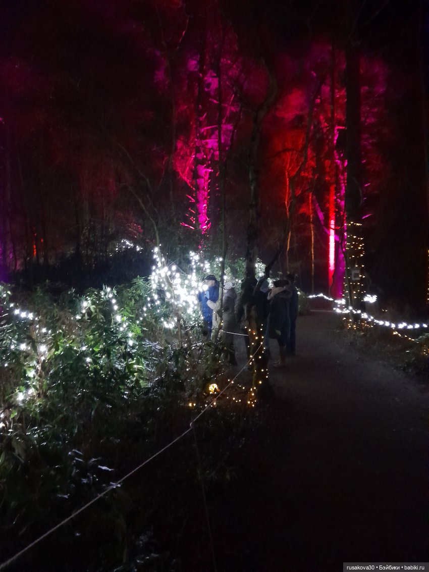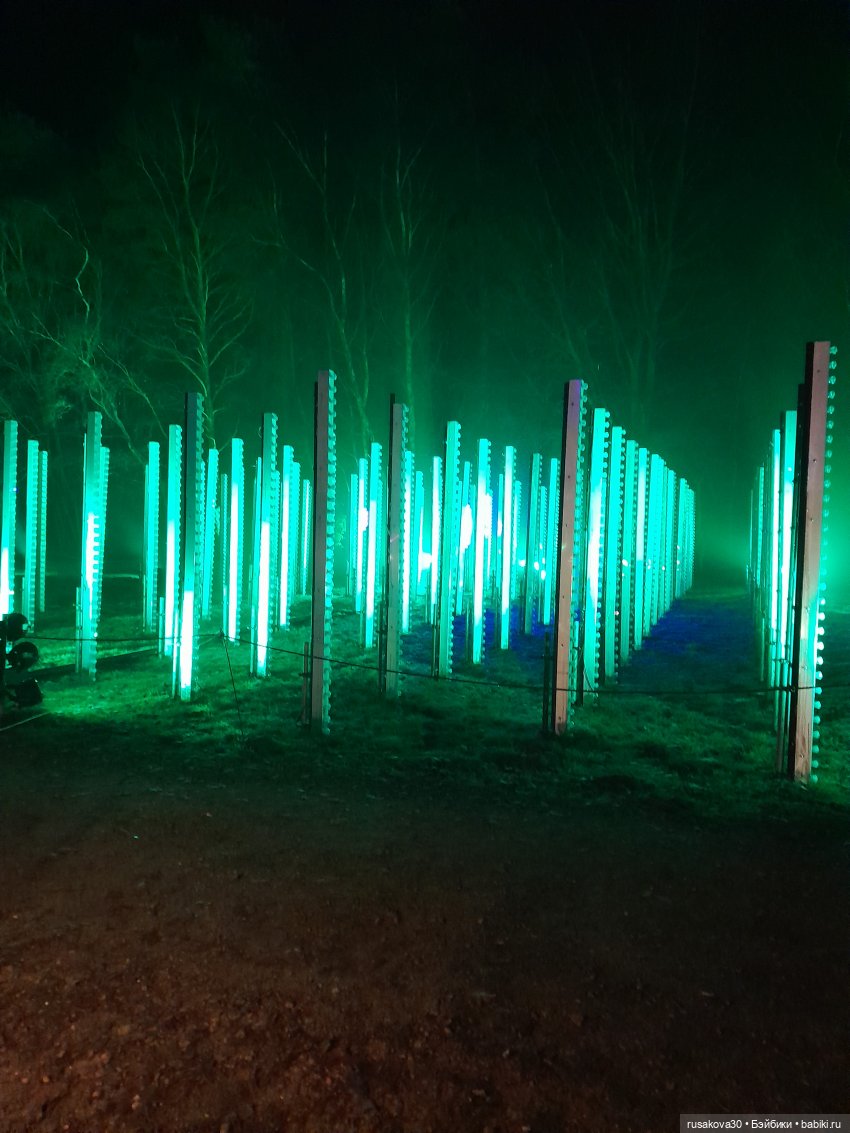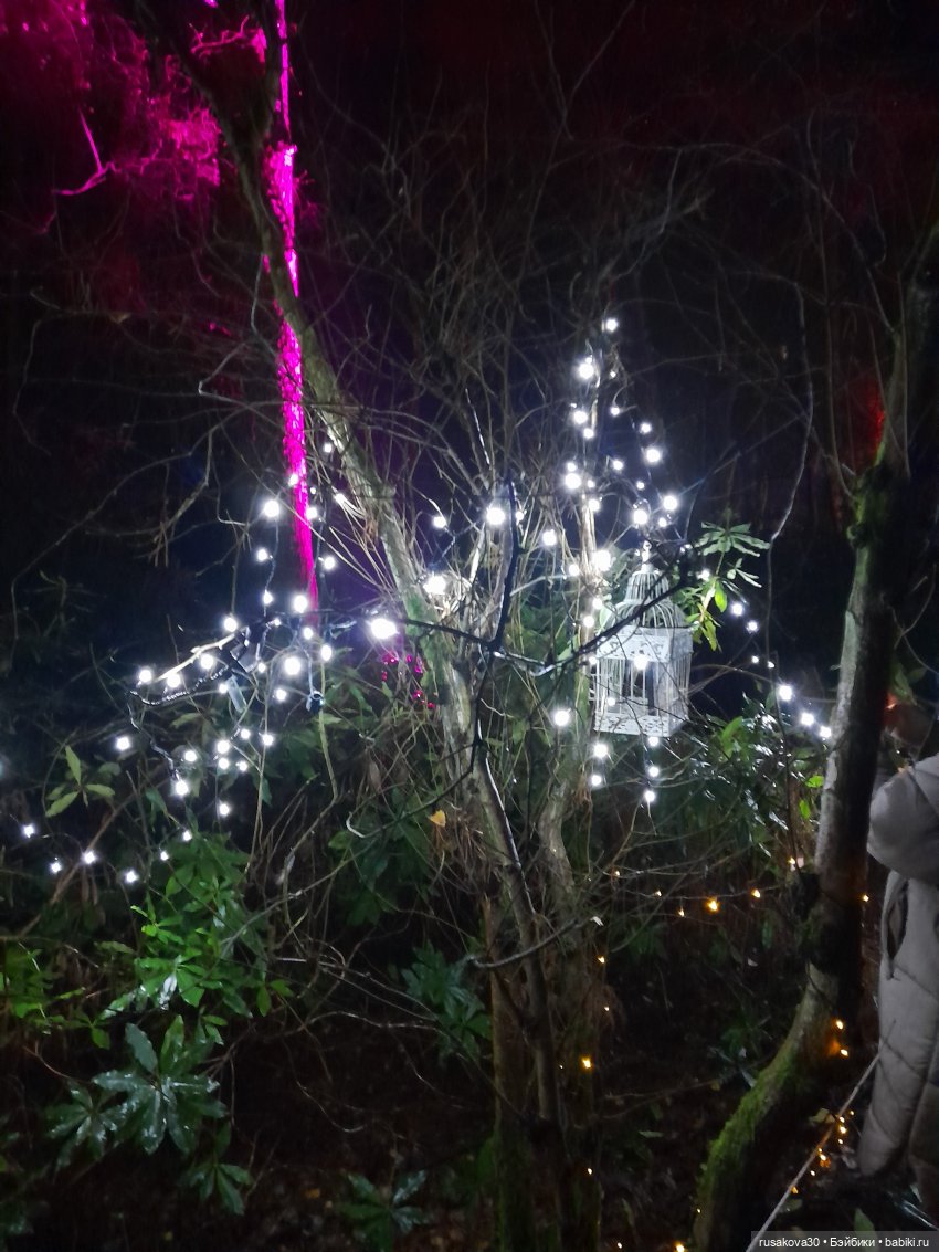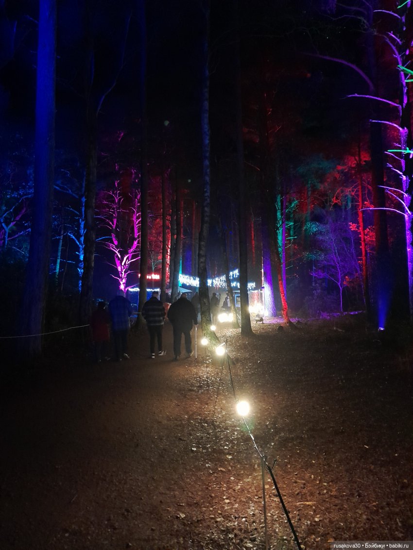 В лесу тихо играла музыка, была шикарная подсветка кустов и деревьев.