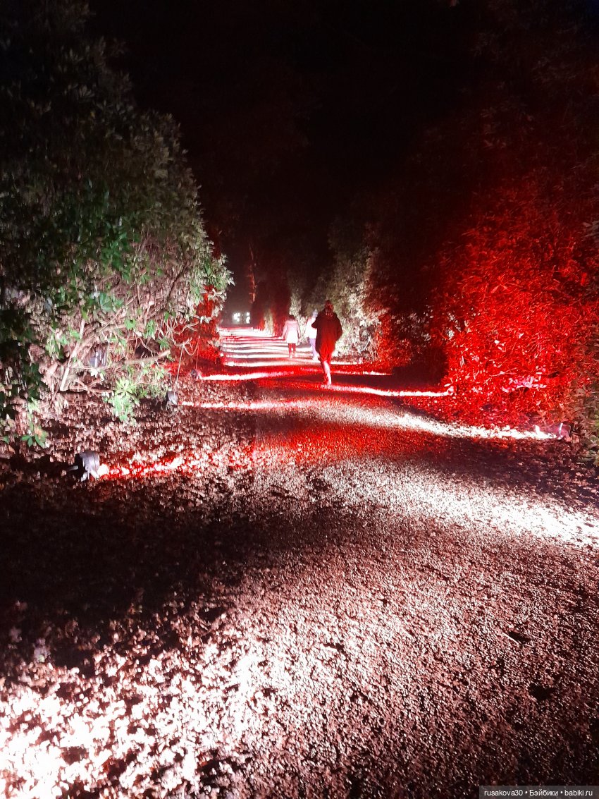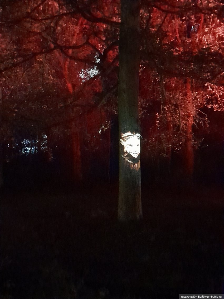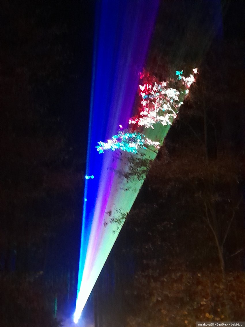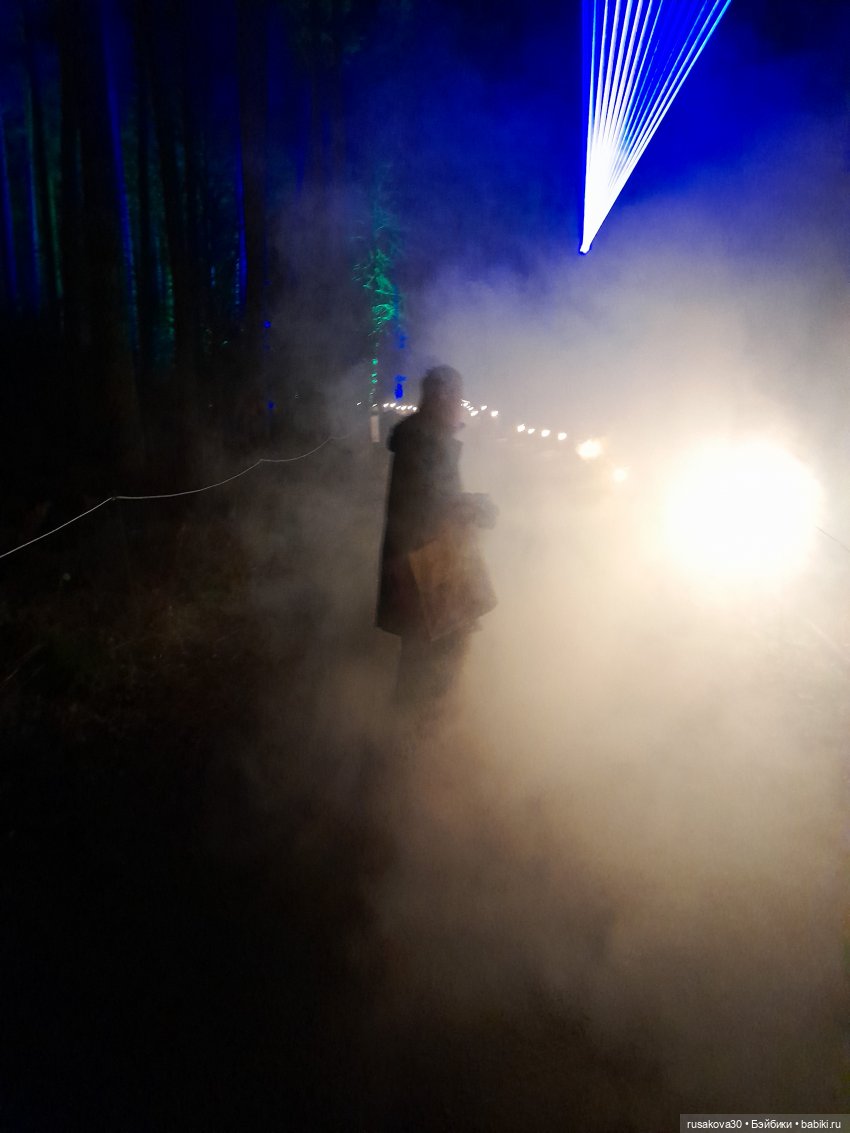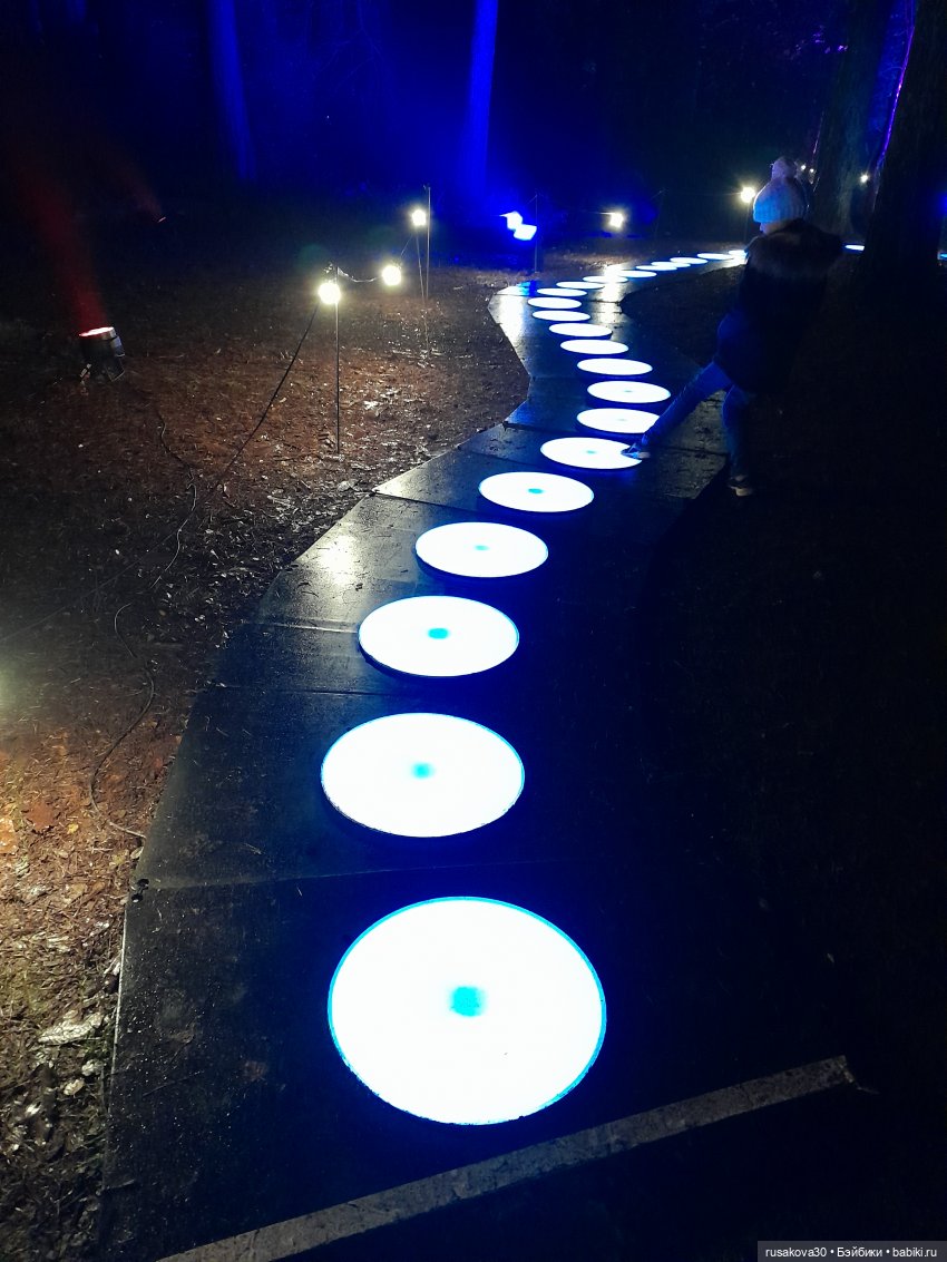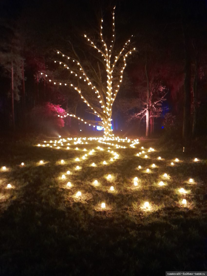 В лесу тихо играла музыка, была шикарная подсветка кустов и деревьев.