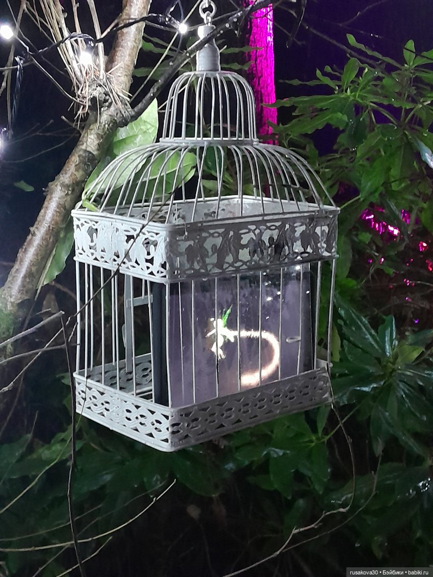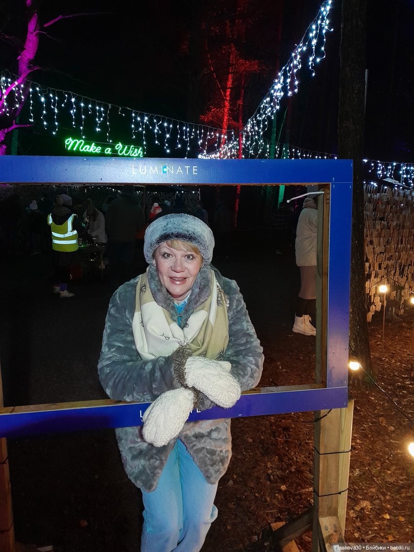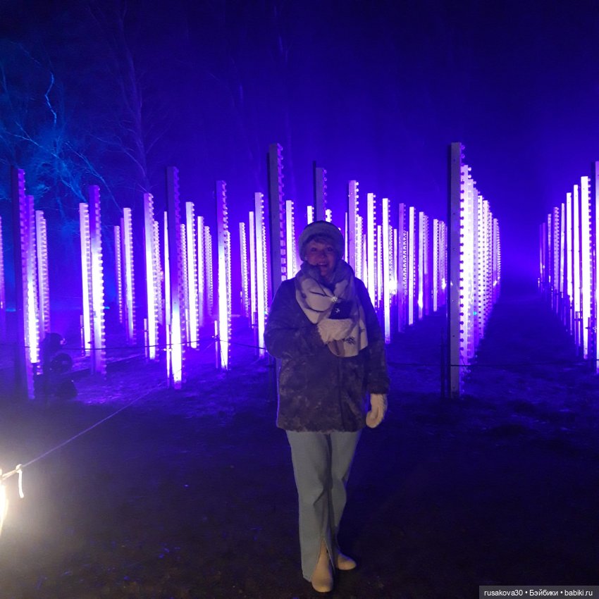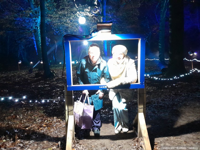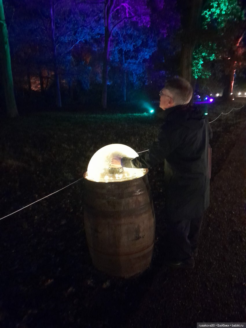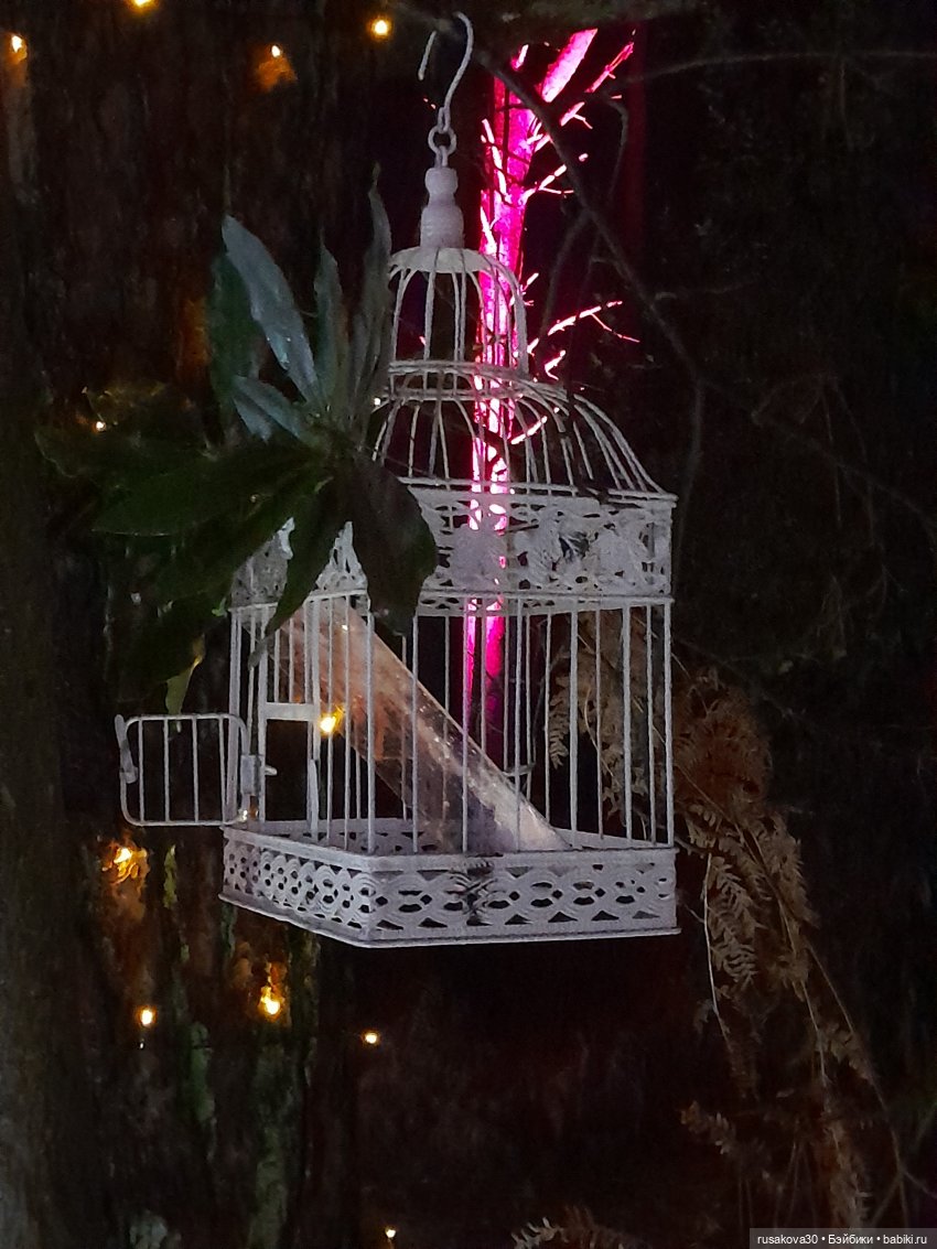 В лесу тихо играла музыка, была шикарная подсветка кустов и деревьев.
