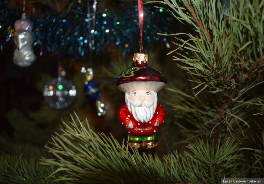 У нас каждый год ретро ёлка — начало коллекции положил большой набор стеклянных шаров и игрушек, купленный в Москве в конце 80-х во время нашей с мужем учёбы в Тимирязевке. Добавляю каждый год только «хрустальные» (акриловые) снежинки и игрушки. Одно из немногих исключений — этот современный старичок-лесовичок: