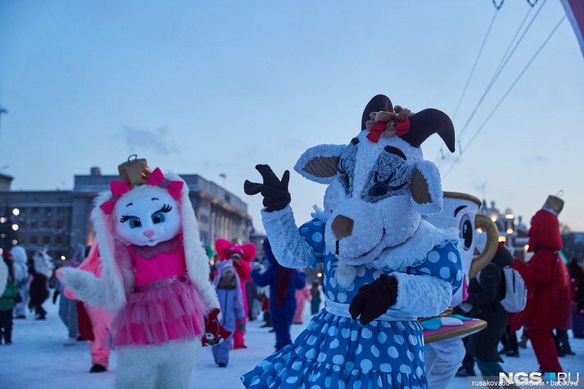 В центре Новосибирска состоялось карнавальное шествие с эффектным финалом — шоу ёлочных игрушек.