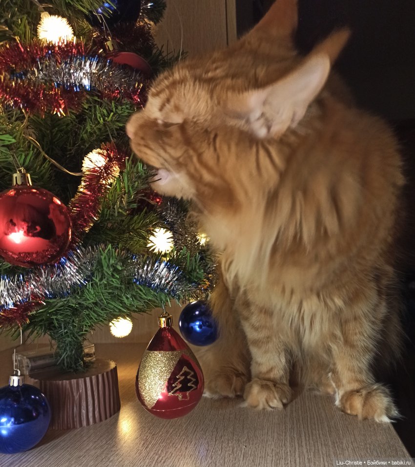 Мы уже несколько лет не наряжаем большую ёлку (а так хочется!). Нарядили маленькую, 60 см. И поставили на полку под самый потолок. Старшая кошка спокойно на мишуру и игрушки реагирует. А младший норовит украшения погрызть, шарики поскидывать. У Вас хвостик воспитанный, сразу видно!