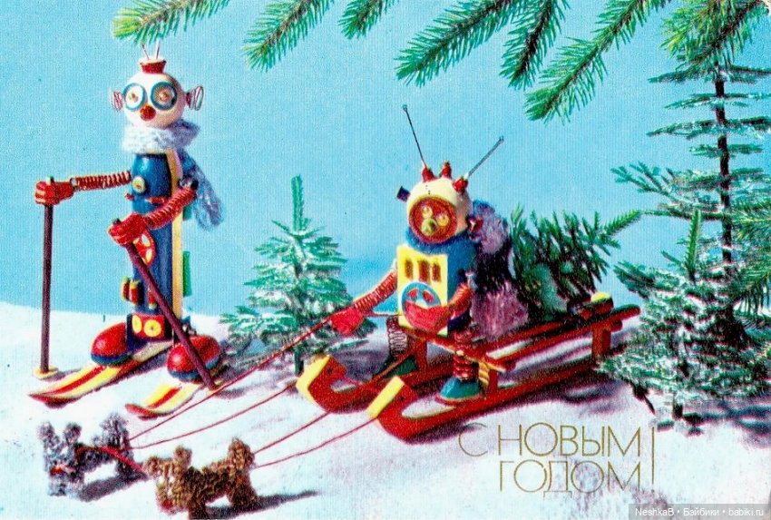 Даже инопланетных гостей, наряжающих ёлку, мы видим на открытке 1974 года.