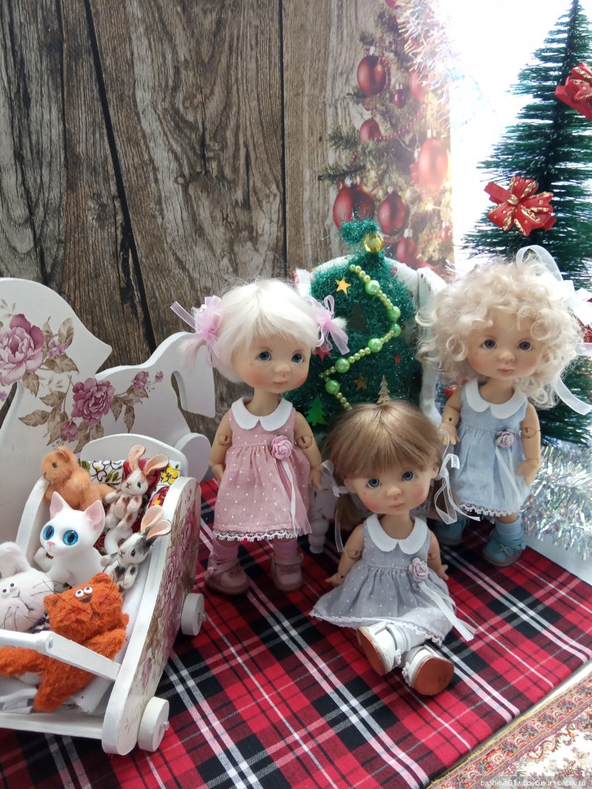 Здравствуйте, дорогие наши гости! Заходите, рады всем, всем, всем! Уже давно отгремели праздничные салюты и люди убрали ёлочки)))Рассказаны все новогоднии истории, кроме нашей.А у нас, тоже был Новый год и подарочки были! Честное-пречестное, вот, посмотрите:)))Девочки мои, оделись в праздничные платьишки, стоят, затаив дыхание…