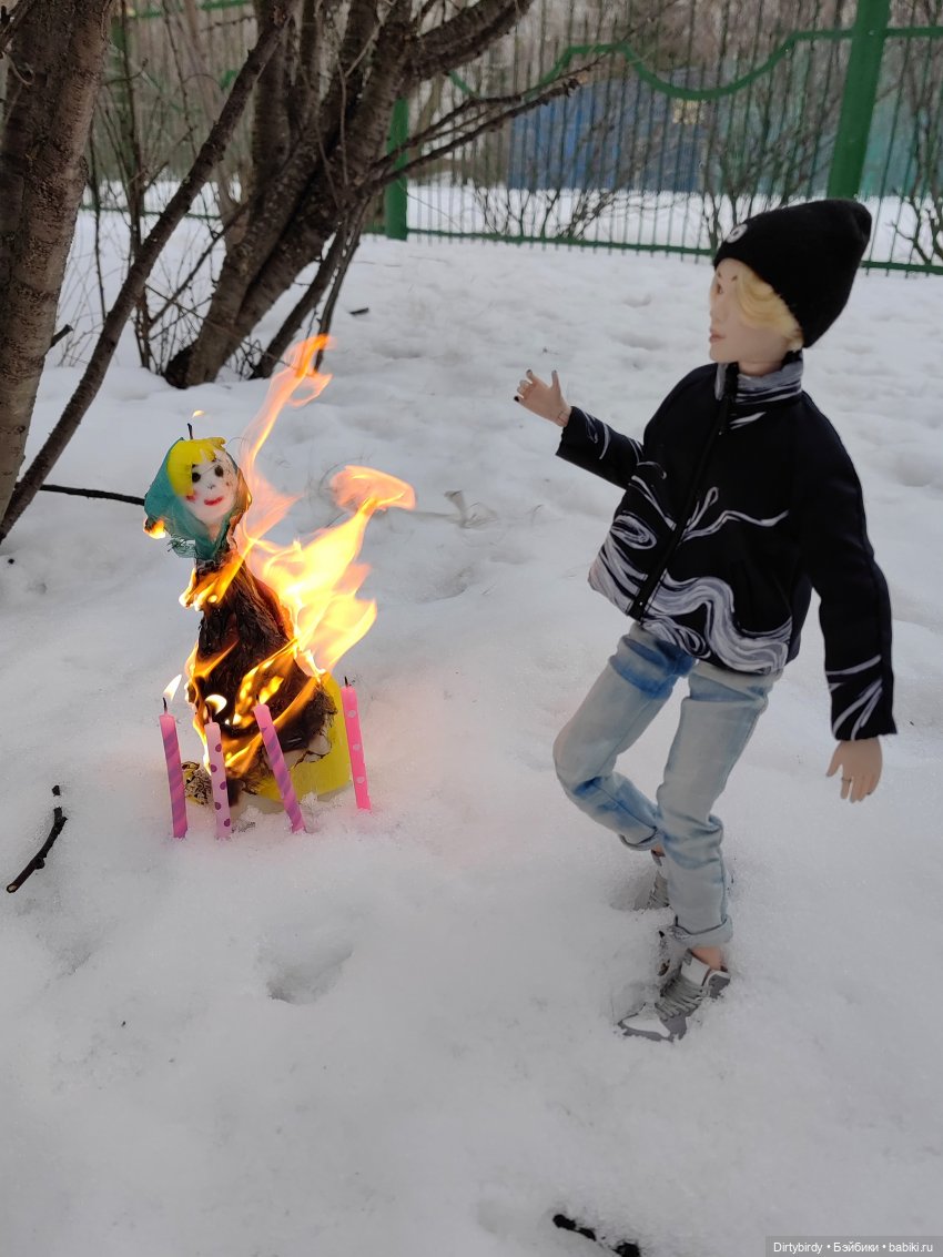 Мои сегодня тоже провожали Масленицу. Разжечь настоящий огонь не смогли из-за сильно ветра, на помощь пришел редактор