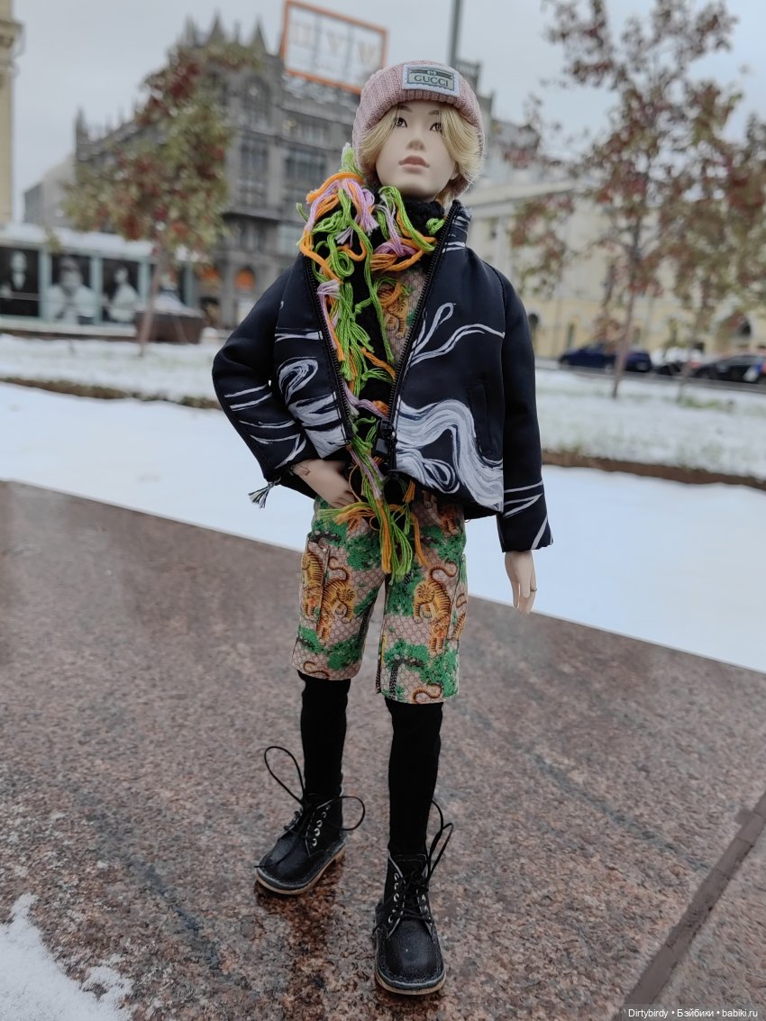 Наряд гуччи комплект: шорты, футболка и шапка. Шарфик-талисман от продюсера и шерстяные штаны и в кои веки ботинки, а не кроссы
