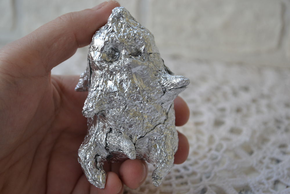 Идея возникла сразу, обмотать какую то заготовку. В качестве основы взяла фольгу. Слепила и вот какая получилась заготовочка.