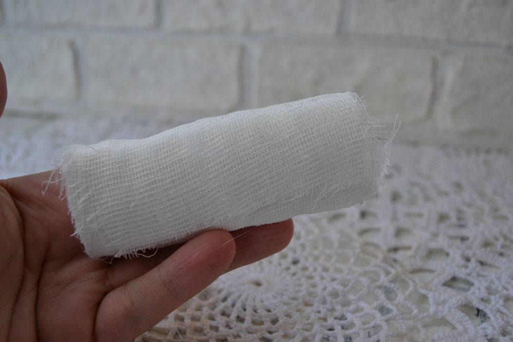 Взяла обычный аптечный бинт. Немного поясню почему бинт, марля либо другой неплотный материал. Он очень капризный, осыпается и с ним я никогда не сталкивалась на своем рукодельном пути.