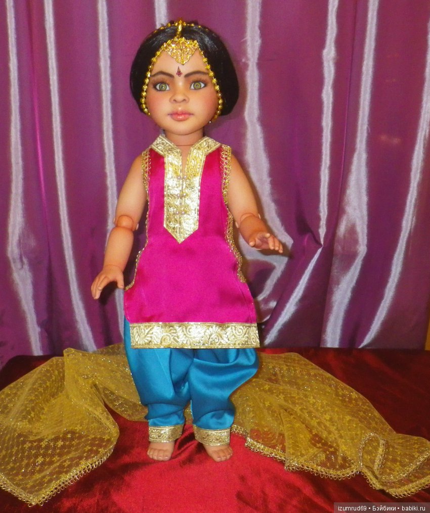 Когда я привезла Мэй домой, я поняла, что надо срочно менять ей наряд, потому что старое платье смотрелось на ней нелепо. Я полетела по магазинам, накупила ОЧЕНЬ много всего: ткани, тесьму, нитки, украшения… И села шить. Решила сшить Мэй сальвар-камиз. Нашла выкройки в интернете и засела за работу. И когда всё сшила и полностью переодела Мэй, то поняла, что она не Мэй. Стала искать индийские имена, чтобы понять на какое моя принцесса откликнется. И нашла.