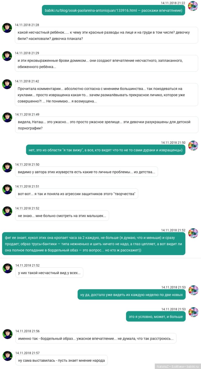 Число тех, кто именно выраженно-неравнодушны к этим куколкам только в основной группе больше 17000 человек, очень многие из которых есть и здесь. И как выглядит то, что делает с паолками Наталья, для огромного числа людей, искренне любящих именно этих кукол — фактически, грубое поругание, которое каждый раз в сочетании с «родилась...» воспринимается ровно в обратном значении этого слова (и смысл не образный, а вполне конкретный и живо ощутимый)…
