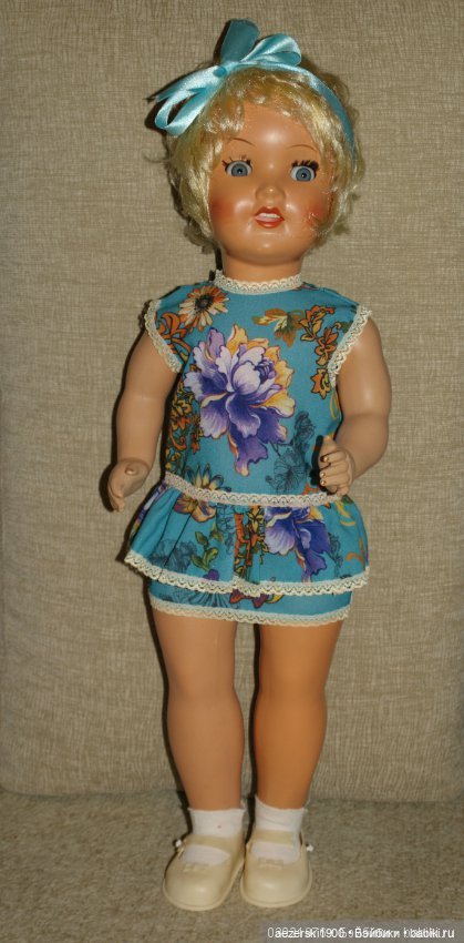 Обращаюсь с просьбой помочь опознать куколку. Рост куколки 60 см. Паричок (точнее полосочка) родной, думаю, что был под шляпкой, поэтому такого вида. Никаких букв и цифр на кукле не обнаружила.