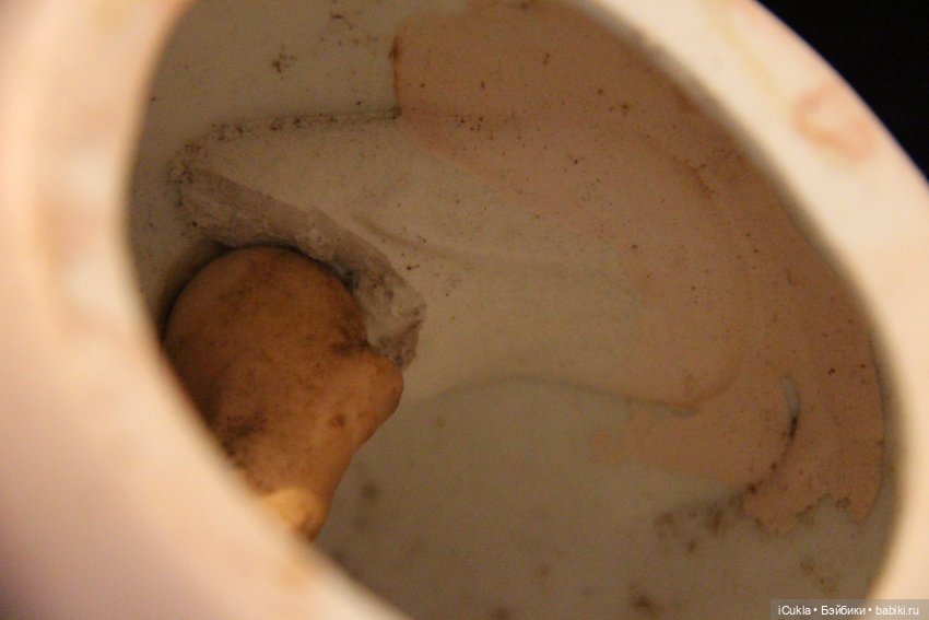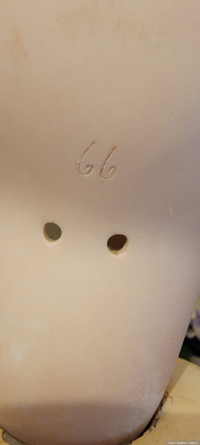 Меня смущает большая разница в состоянии тела или головы — голова как новая, а тело со следами времени. Не могла ли иметь место гибридизация? На современных головах (неоригинальных) не заморачиваются с клеймом и надписями, поэтому номер 66 может просто обозначать партию отливки или, например, номер молда. На фабриках, которые занимаются отливкой, делают головы, иногда руки-ноги и туловище по отдельности, их потом покупают небольшие мастерские и даже более или менее крупные производства, где отдельные части собирают в куклу или сажают голову на набивное тело, делают мейк, парик, шьют одежду, обувь и т.д. Не может быть такое, что у Вас на старое тело посажена более новая голова? Или, возможно, голову просто реставрировали?