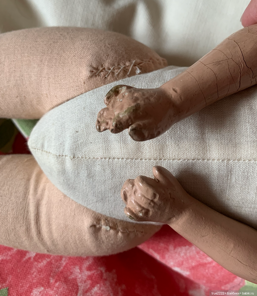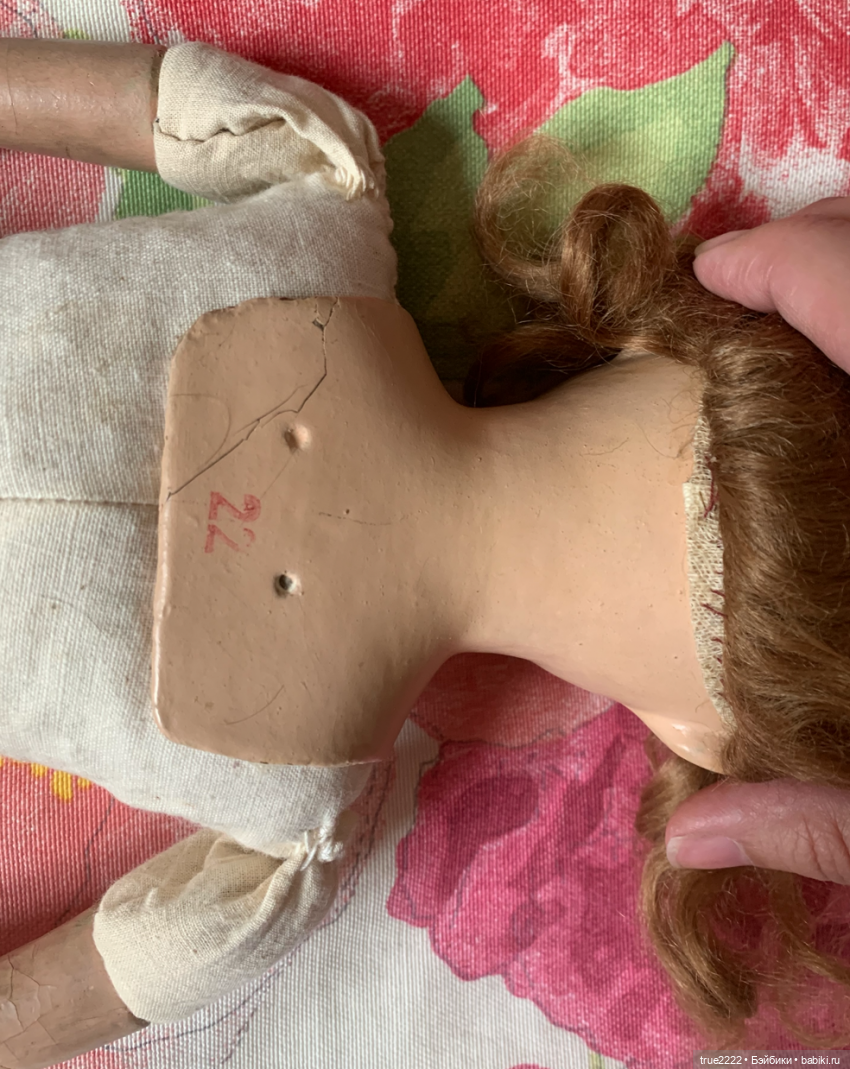 Глаза стеклянные спящие, тело набито как будто соломой или опилками, ноги тоже набиты чем-то плотным. Похоже, что зубки нарисованы на текстильной ленточке. Парик прикреплен крепко, не решаюсь его отделить от головы. Сзади нет никакого клейма, только красным цветом написано «22».
