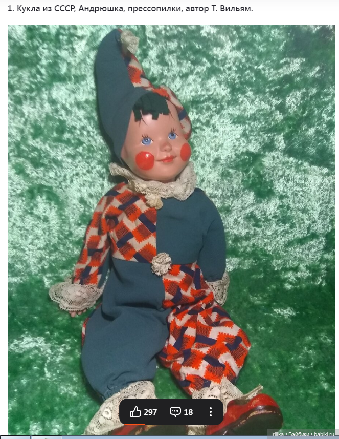 Уважаемые коллекционеры! Помогите пожалуйста узнать как правильно называлась кукла ( скоморох, петрушка, клоун или еще как-то), кто автор и когда выпускалась? На шее есть клеймо слоник, значит МФК ( кругозор). Заранее большое спасибо.