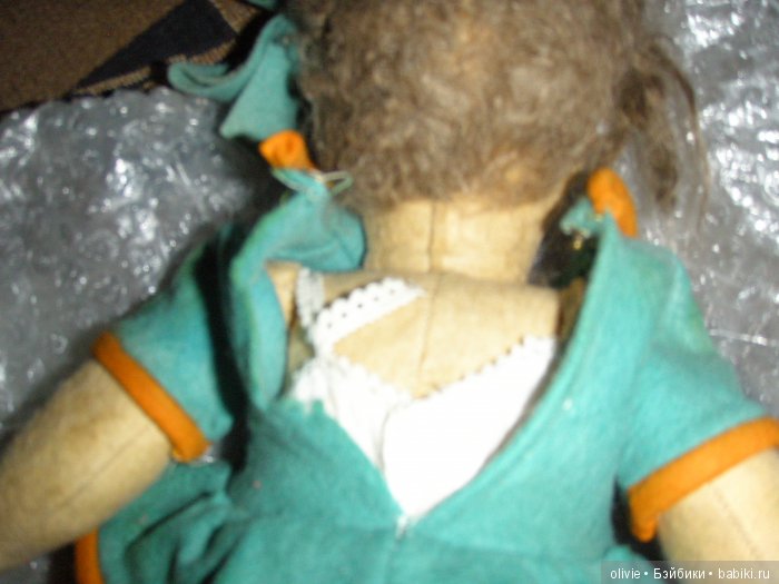 Фото шва на шее плохого качества, на зигзаг вроде бы не похоже, нижнее белье комбинзончиком-цельное, волосы пишет-исскуственные /я спрашивала о мохеровых волосах -не слышал/, рост куколкы забыл написать. На фотографии, кде крупно лицо- на шее вправо или нитка, или моль, или мне это ка