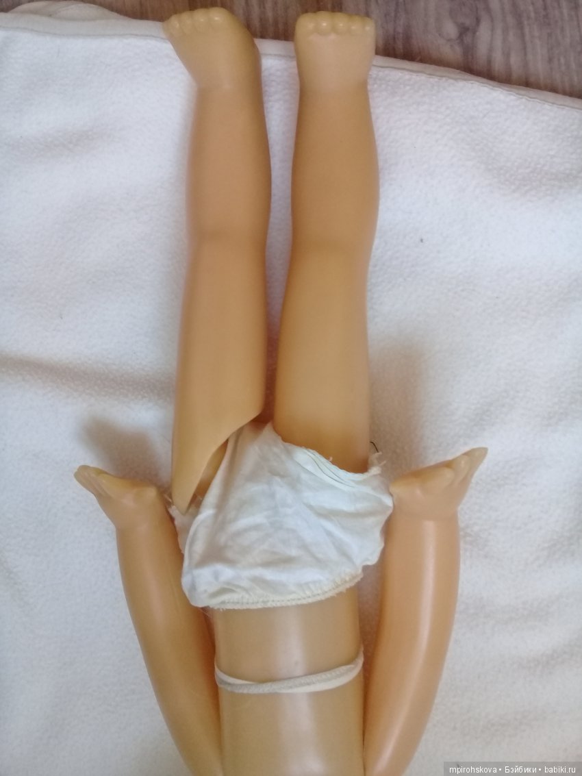 Каталоги и картинки в интернете смотрели с подругой в 4 глаза, она выкладывала фото на других ресурсах, но так и не определились в происхождении куклы. Предполагаем, что кукла Саратовской (или Днепропетровской – моё дополнение) фабрики игрушек. Возможно, что платье не родное и она была выпущена мальчиком. В каталоге есть похожий, но там, к сожалению, фото только в одежде и низкого качества, при увеличении черты лица и ручки разглядеть не удается. Вся надежда, что у кого-то есть такая кукла и Вы откликнитесь! Прошу обратить внимание, что у куклы удивительно узкие бедра (и длинные ноги). Глазки спящие. Клейма нет.»