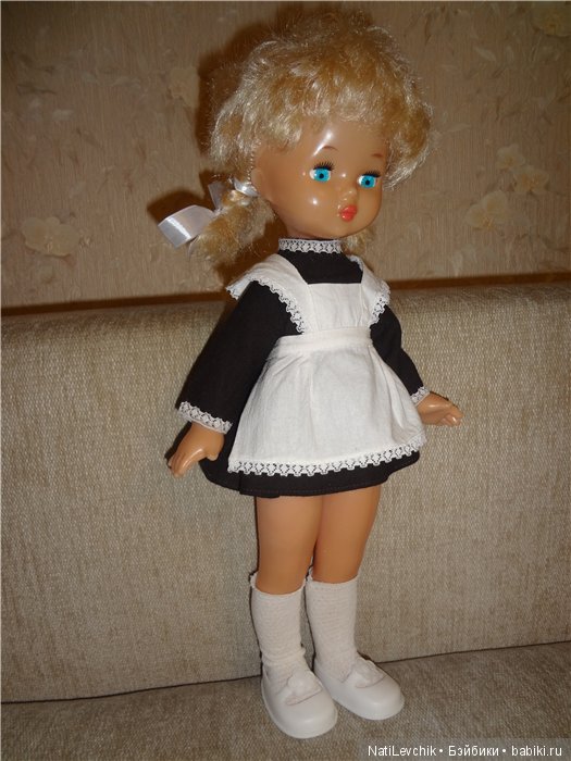 Наташа, рост немного меньше роста Нины, примерно 60 см; блондинка короткие кучерявые волосы; цвет глаз не помню, они закрывались; одета в школьную форму, туфли белые, ноги толще чем у Нины и короче(по ощущениям), с пищиком, вся пластиковая. Год выпуска, могу ориентироваться когда подарили 1984-85гг. Искала фото где мы с ней, но пока не нашла, там она все равно со спины. Найду выложу. Хотелось бы установить какую куклу искать. Пробежалась по картинкам, ничего не напомнило её или я искать не умею.