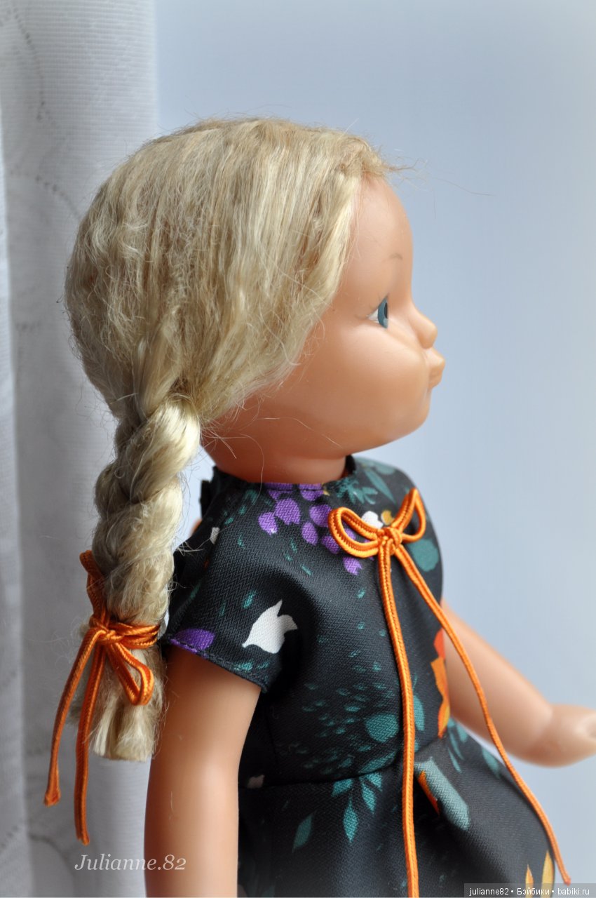 Даже предположений у меня никаких нет. Родная ли одежда, не знаю. Думаю, что нет. Руки, ноги на резинке. Очень интересная шея. Головка может наклоняться. Голова тоже на резинке. Рост около 40-42 см. Паричковая.