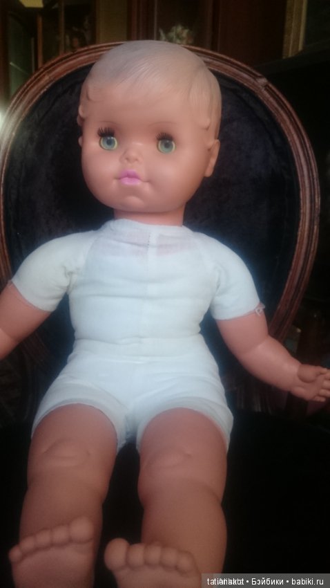 Друзья, кто это? Очень большой пупс, очень мягкая резина, руки, ноги, голова. Цвет волос стерся.Набивное тело довольно плоское. Губы с родной краской. Глаза, как у советских кукол, ещё с пластмассовыми ресницами. Но вот качество резины(или винила, я незнаю как правильно) очень мягкое. Рост 62см, окружность головы 43 см. ОТЛИЧИТЕЛЬНАЯ ЧЕРТА-ЯМОЧКА В ВИДЕ ТОЧКИ НА ПОДБОРОДКЕ. Чьё это производство? Какой год? Заранее благодарю.