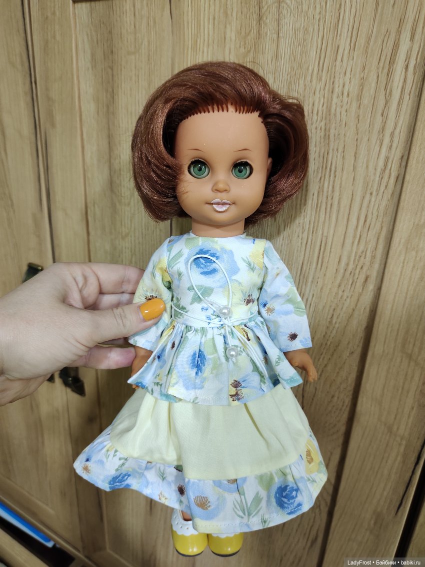 Моя кукла, куплена мне вас детстве.Тоже миниатюрная, наряд родной. Только бантики были красные.