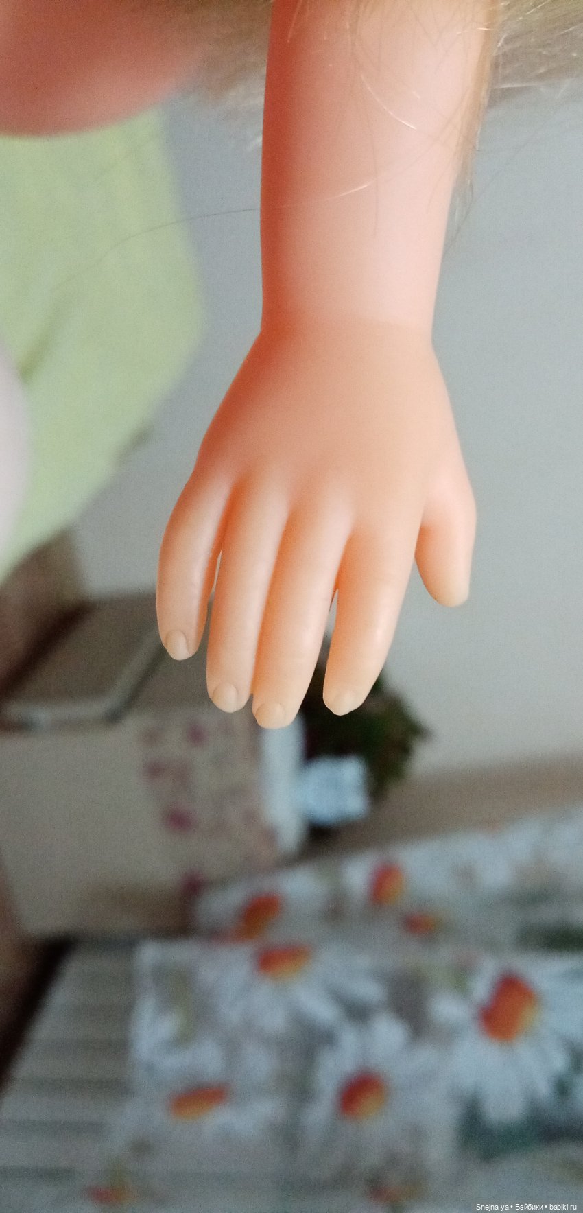 Волосы очень густо прошиты. За все время расчёсывания не выпало ни волоска. Прядки словно часто-часто мелированы. Сама пластмасса без царапин даже. Глаза яркие, не выцвели, не потускнели даже после бани кукле, ресницы на месте. А это, напомню, кукла б/у в детских руках. Завтра рассмотрю родную, оставшуюся в живых, одежду. Бодик, пока стирала, рассмотрела, качественная строчка, ткань только немножко пошоркана, машинка от катышков все исправит.