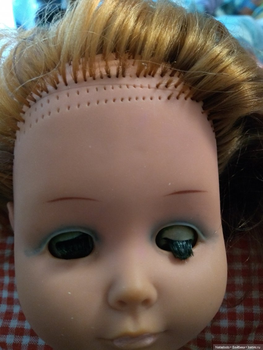 Купила вот такую красивую и грустную девочку. Кукла скорее всего ГДР, хотя нет клейма и никаких цифр. Со слов продавца, куплена в 1973 в Москве. На вопрос про тени на веках сказала, что может быть она разрисовала в детстве, но точно не помнит. Эти тени очень симметрично нарисованы и щеткой с мылом не оттерлись. Поэтому я задумалась, что это может оказаться все же не детским художеством, а частью фабричного образа и стоит оставить все как есть. Подскажите, пожалуйста, бывали немки с таким макияжем?