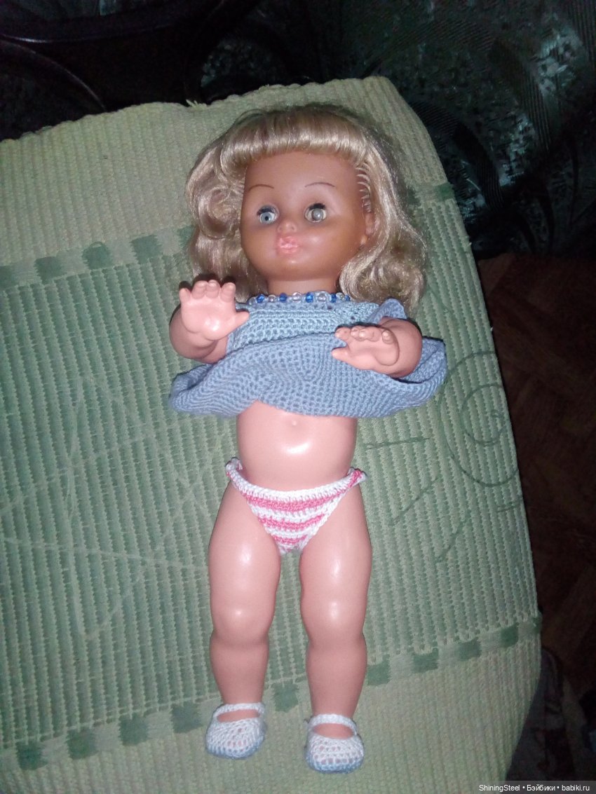 Совершенно согласна с Вами- что у этих кукол взрослые лица для детского тела с согнутыми ножками. Но у моей куклы ещё ( как мне кажется ) непропорционально большая голова для такого тела, и длинные волосы, что вообще не встречается у пупсо- подобных кукол.