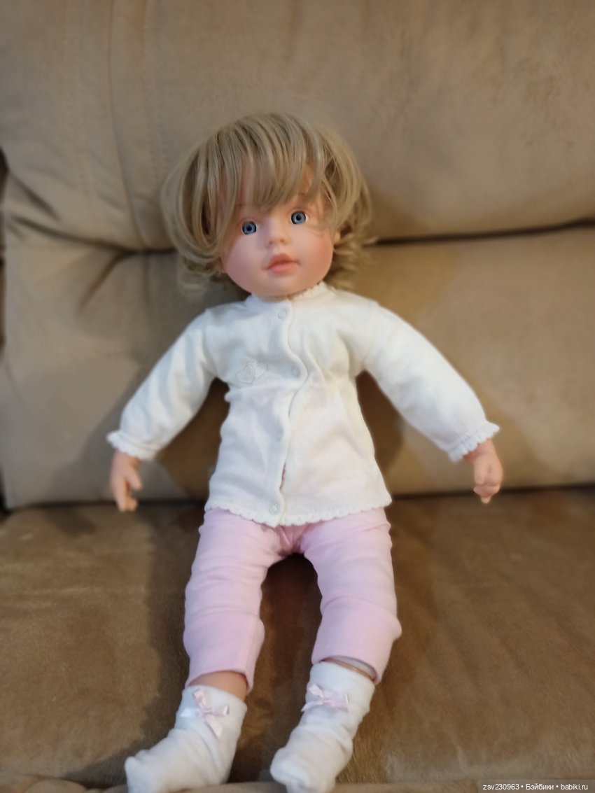 Помогите опознать куклу.Она мне случайно досталась лет 10 назад, уже не новая, дали отремонтировать да так и осталась.Тело мягконабивное.Паричковая — родной.Комбинезон есть белый трикотаж.Кто она ? Таких не вижу.Выпускались когда и где.Это не Китай точно.