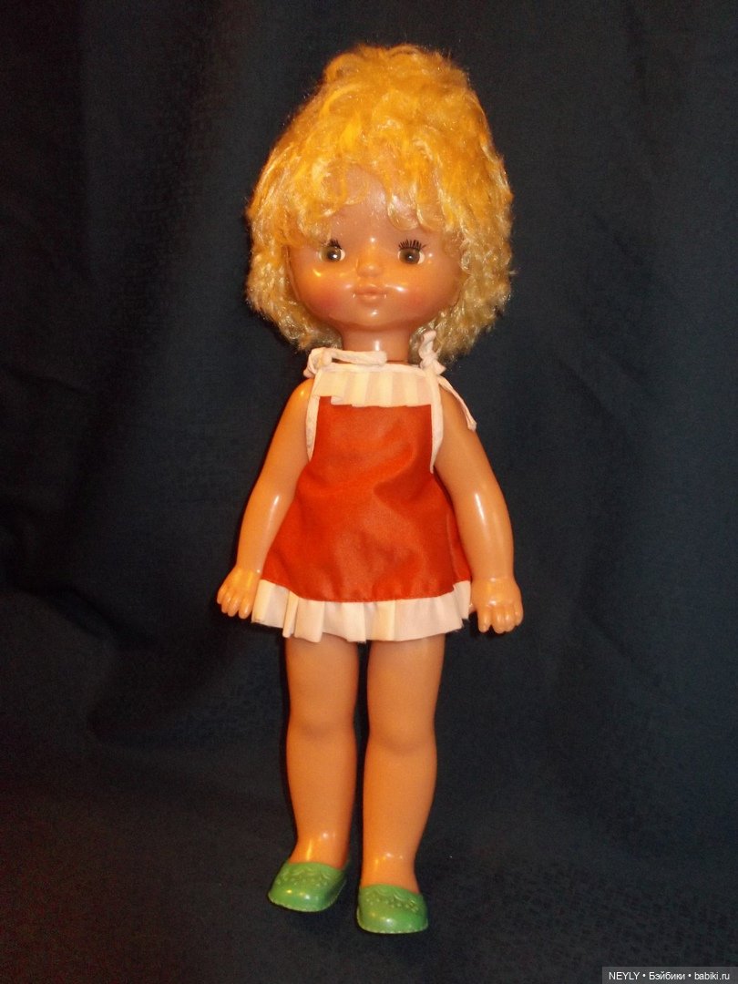 Сегодня приобрела вот такую красотулечку и пришла к вам за помощью. Помогите, пожалуйста, определить фабрику производителя. 40 сантиметров обаяния, пластик плотный глянцевый, голова и ножки на винтах, ручки — на резинках. Одежда родная. Заранее прошу прощения за вид одежды. И стирала, и замачивала с ядрёными моющими средствами, но плесень не сдалась и пятна на сарафане остались непобедимыми. Туфельки родные, но с дизайнерскими росписями, которые ни белизна, ни бензин не берёт) Ещё хозяюшка куклы сообщила, что на этикетке куклы было имя «Нелли», поэтому куклу так в игре и называли. В топике Anka33 (надеюсь не ошиблась с ником) среди украинских красавиц видела очень похожую девочку с рыжими волосиками, но она там не опознана. Вернее сказать, имя её не установили. Может я и ошибаюсь с определением. Очень надеюсь на вашу подсказку. Буду очень признательна за помощь!