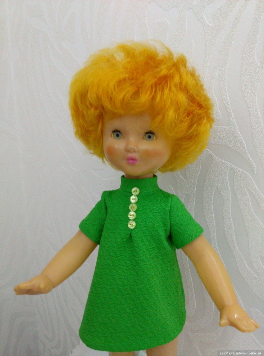 На одном из фото — её родное платье. Помню, что в детстве мне оно не нравилось( Сейчас тоже считаю, что как-то это платье кукле не идет, к тому же материал на ощупь полностью синтетический.