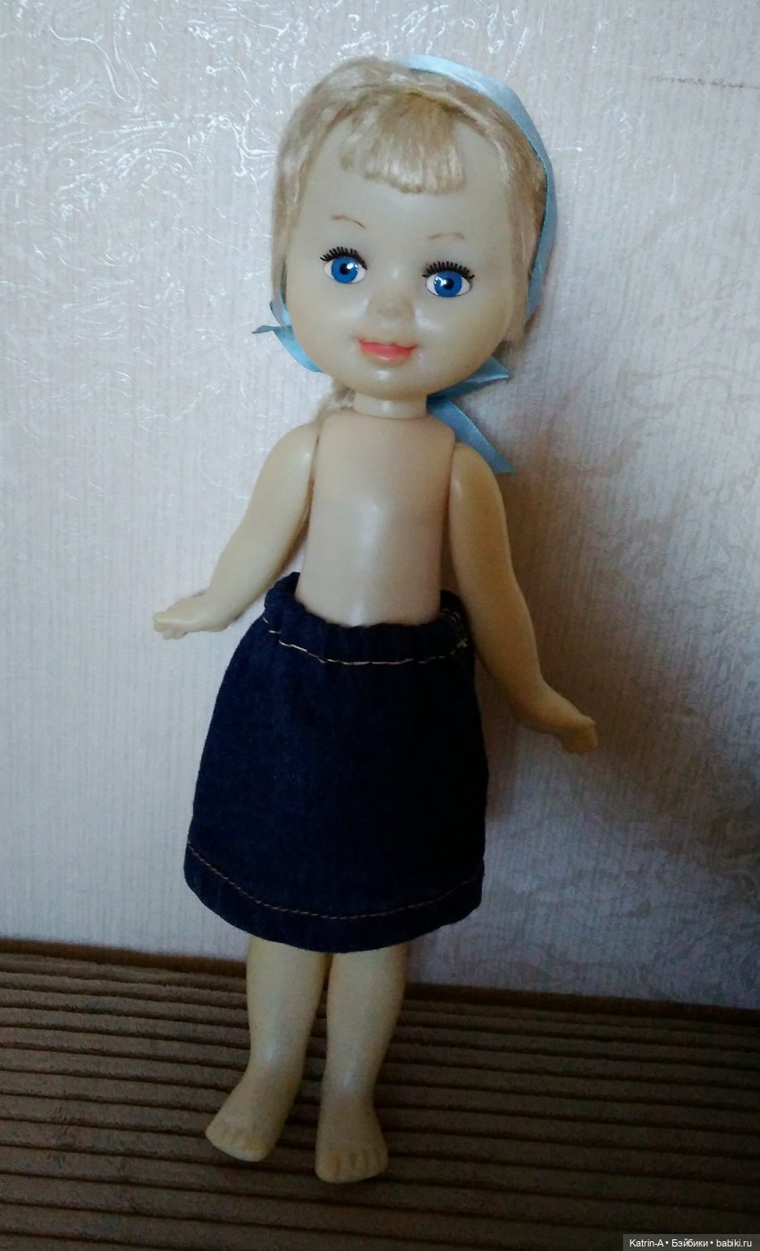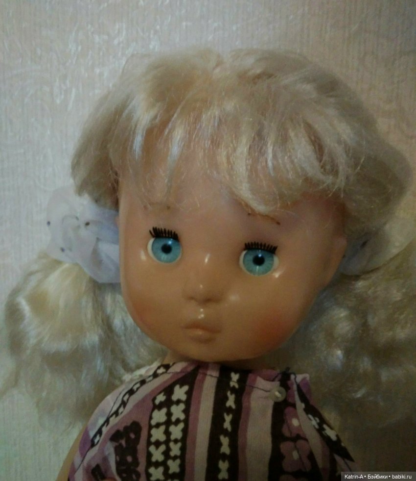 И стало интересно, как зовут куколку! По фото в интернете она напоминает куколок фабрики 8 марта. Чем-то напоминает Лену. Рост 52 см, пищалка на спинке. Может, кто-то подскажет, кто эта девочка?