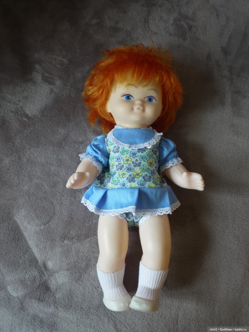 Меня смутила голова и крепление головы, а так-тело, руки, ноги, размер, все как у моего пупса Кузедеевского (он слева, со спящими глазками). Я склоняюсь к тому, что рыжик — поздний ребенок этой фабрики. Закрылась-то она в 1994 году. Резинка, соединяющая ноги руки-старая.