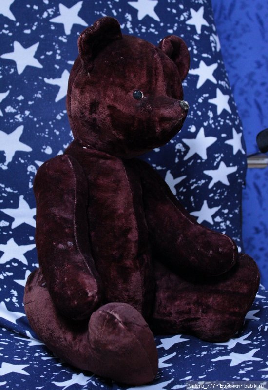И вот, объект желания уже дома, постираны вещички, протерта шкурка. Сидит, стеклянными глазками смотрит. Очень хорошо набита опилками, три лапы двигаются, одну прежние хозяева пришили. Рост — приблизительно 45 см. Интересно тельце – оно не плюшевое, а из ткани типа байки, но такое впечатление, что «родное», уж очень хорошо сшито, с горбиком и набито соломой.