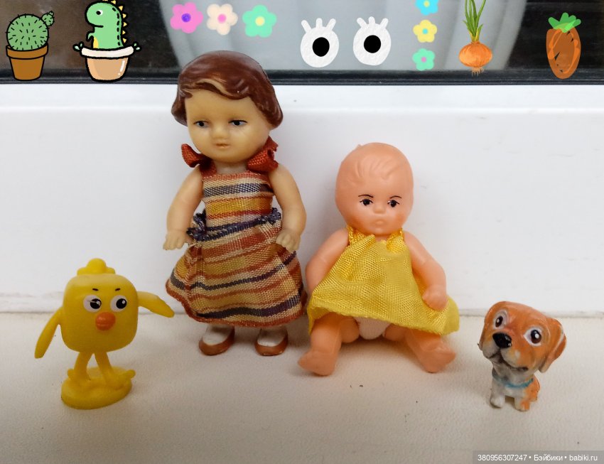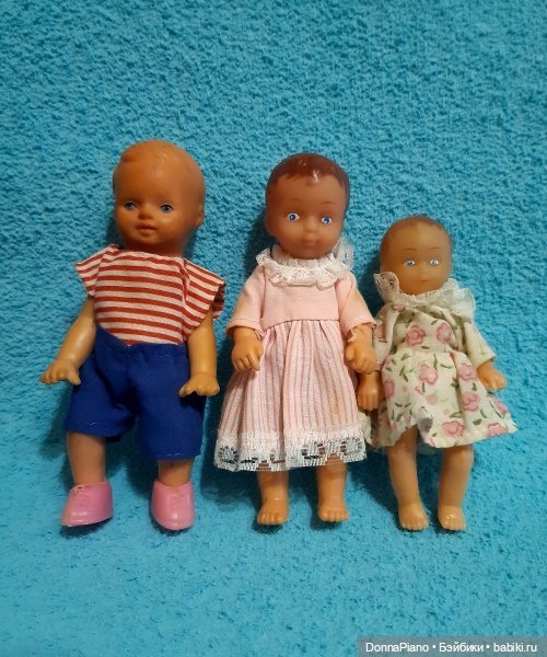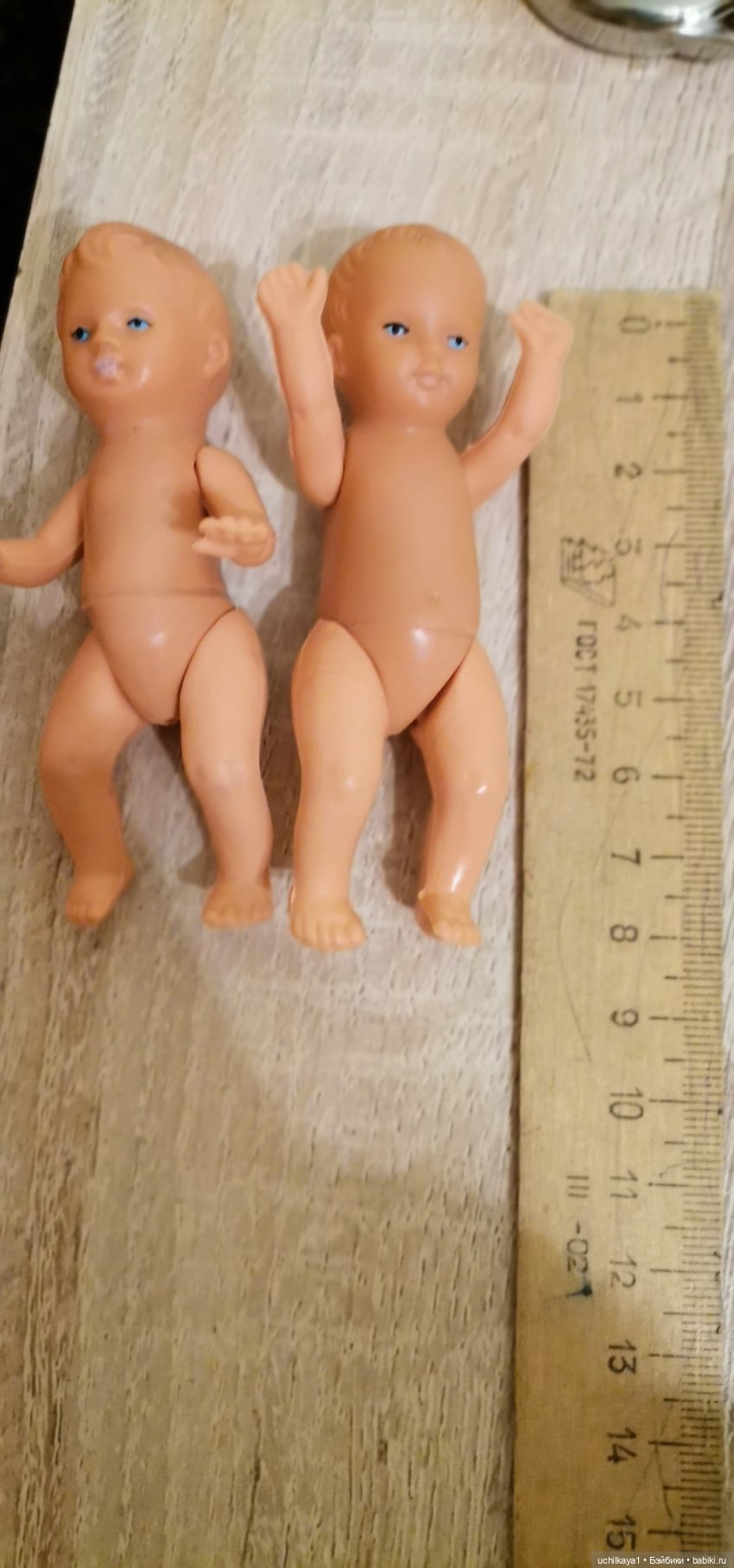 Личики и причёски у малышей абсолютно разные. Тельца немного отличаются. У девочки имеется пупок и попа прорисована, у мальчика нет. Ручки одинаковые, на левой пальчики согнуты, кроме указательного. Ручки и ножки из плотной резины, тельца полые внутри.
