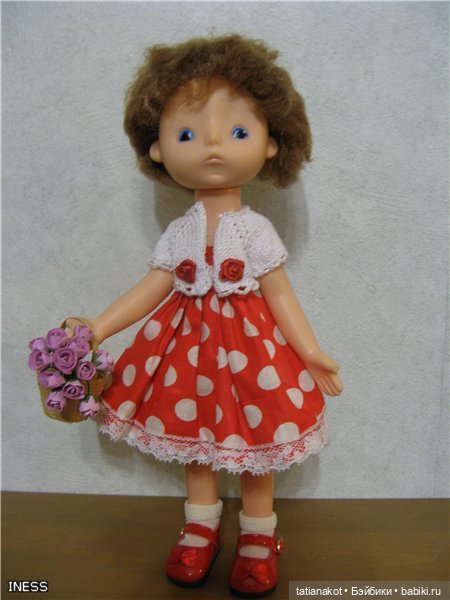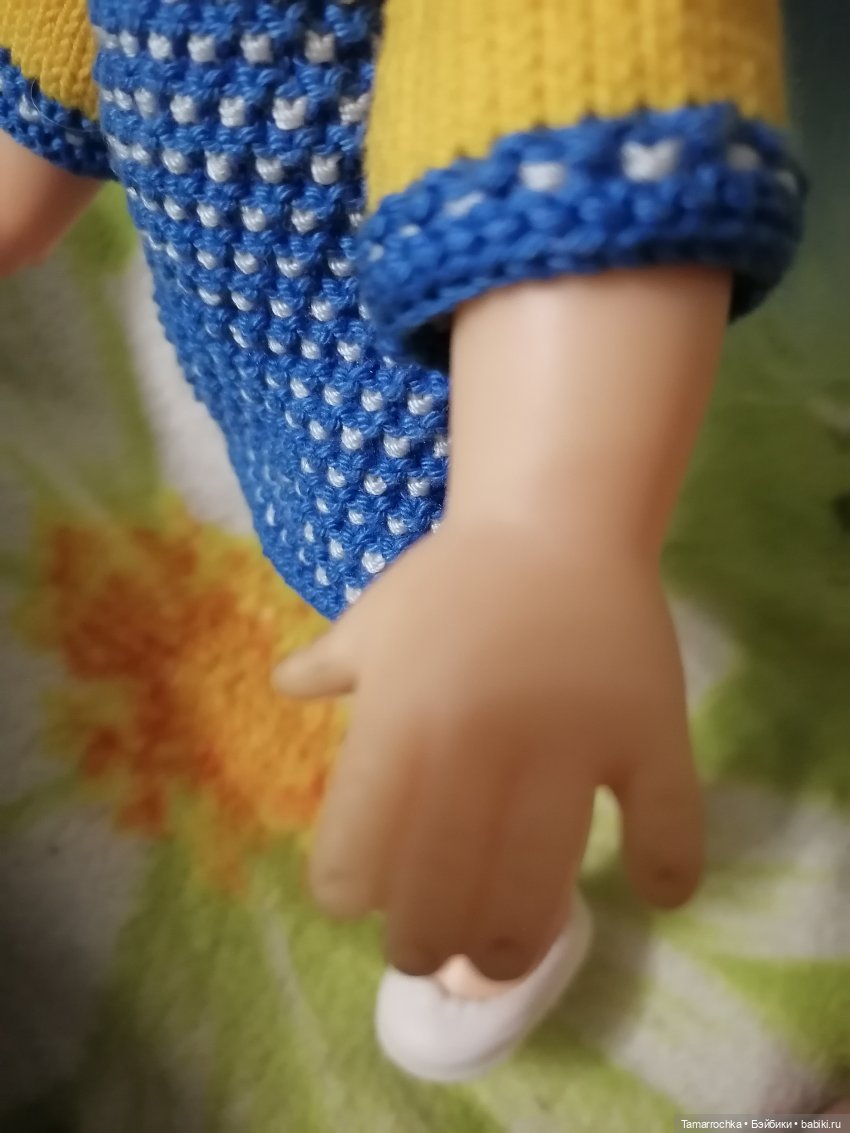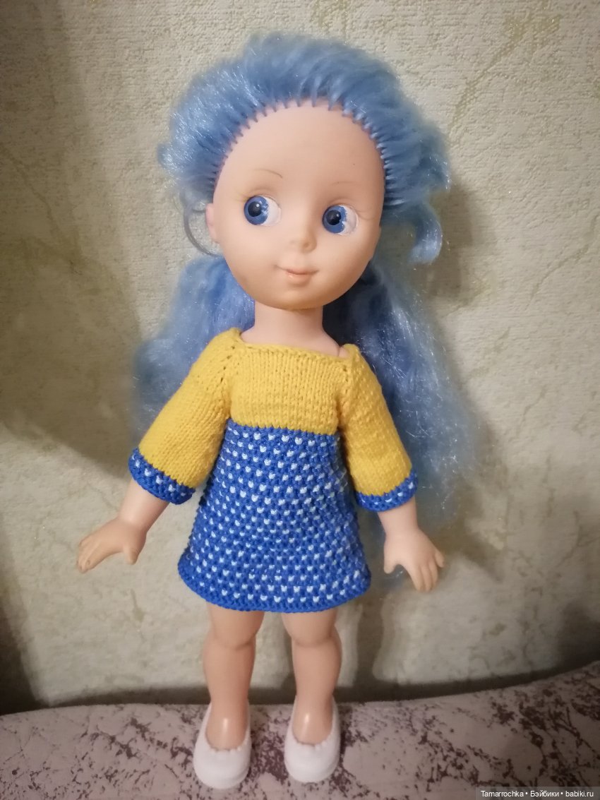 Куколка 35 см, головка и ручки резиновые или виниловые, не пойму; тело и ножки — полиэтилен. Одежда была в подборе, нарядила в паолкин свитерочек и юбочку. Туфельки подошли от Мии, купила на WB.