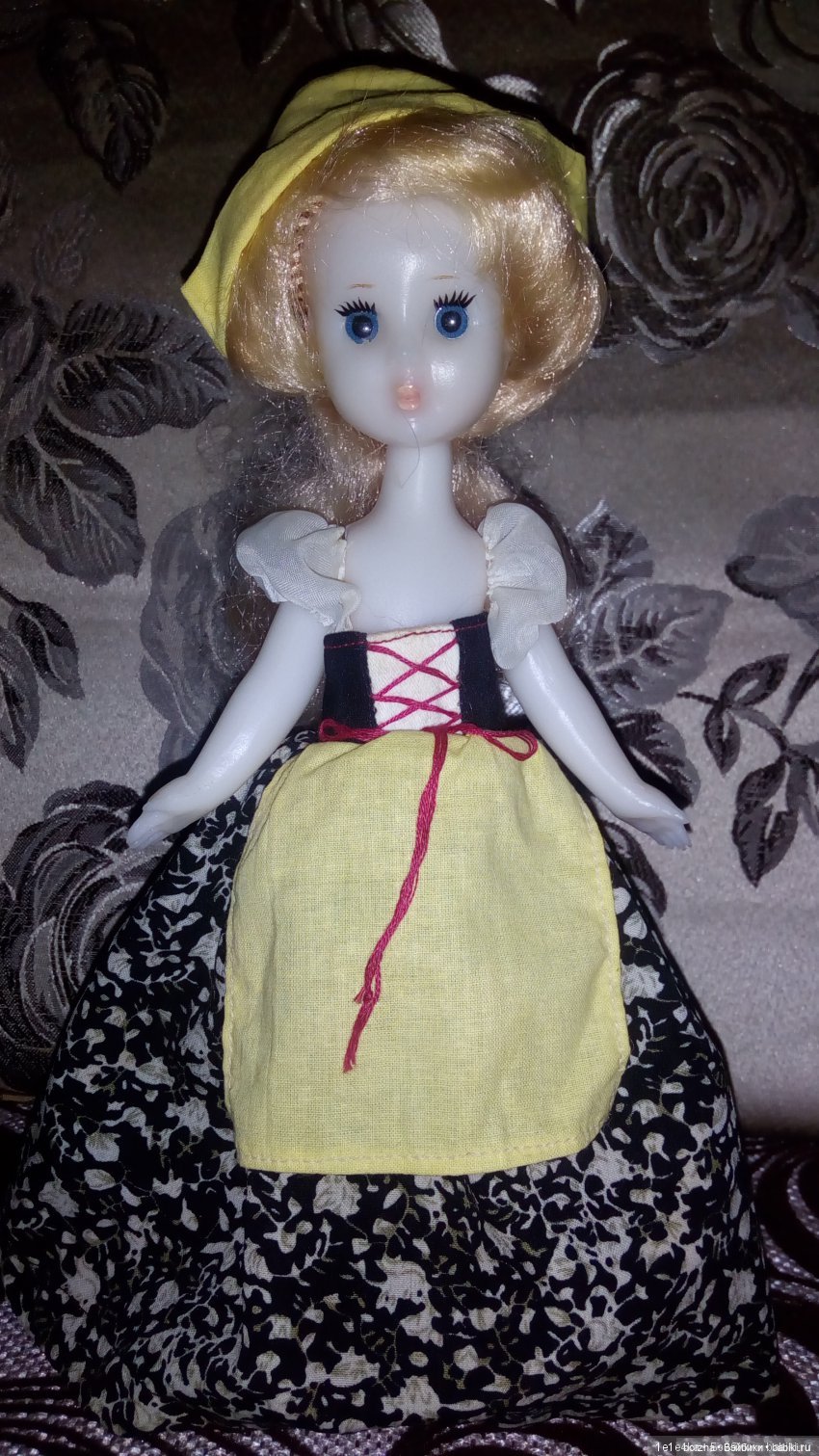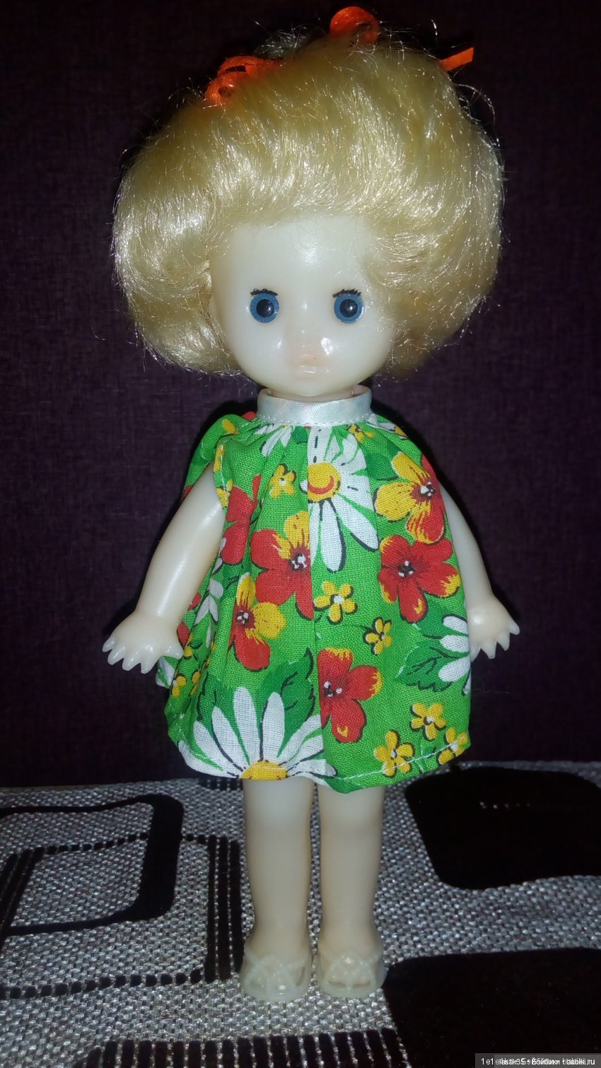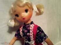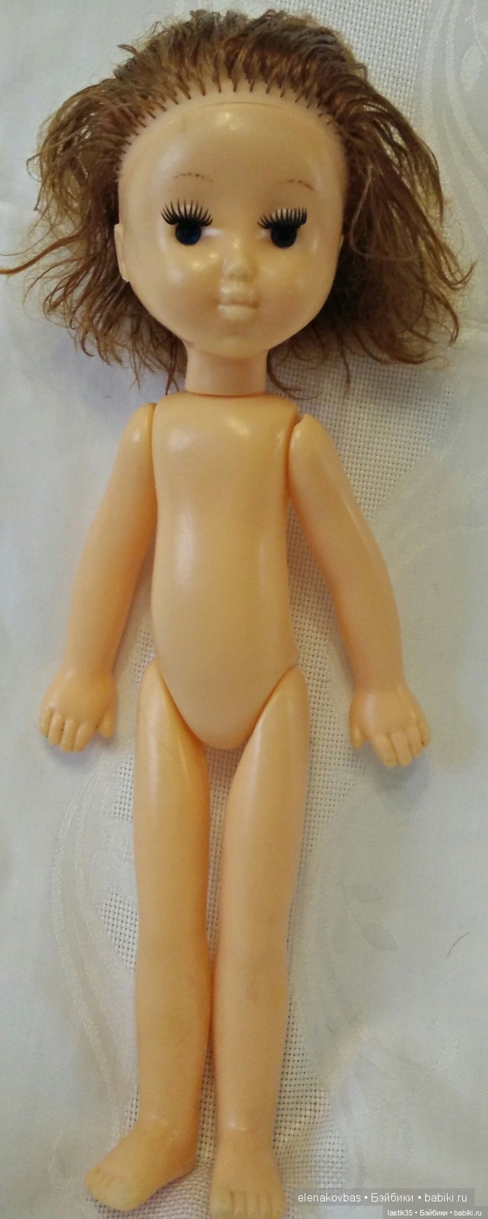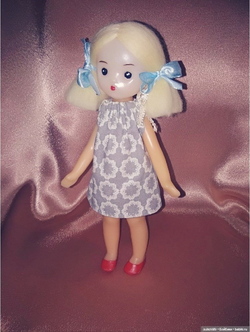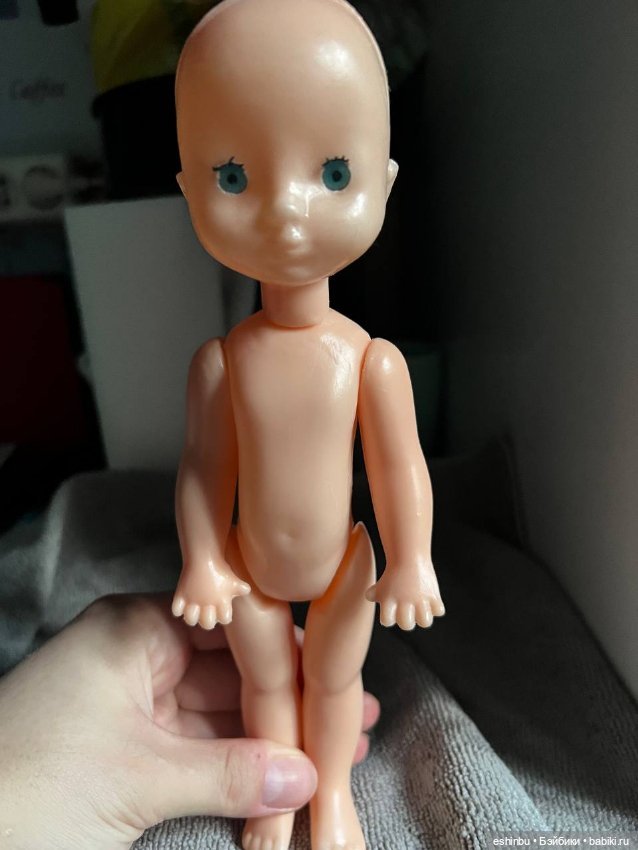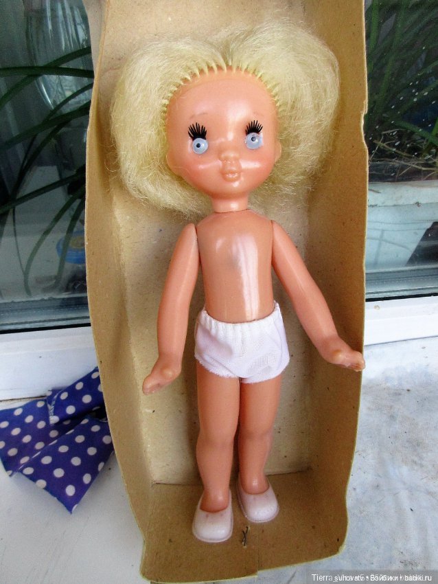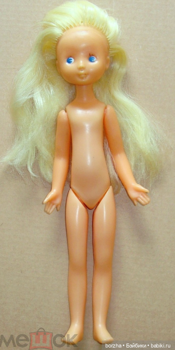Белый полиэтилен, желтые короткие волосы, глаза статичные, рост примерно 30 см, худенькая. Пыталась найти на просторах Интернета, но пока мои поиски не увенчались успехом. Помогите, пожалуйста.