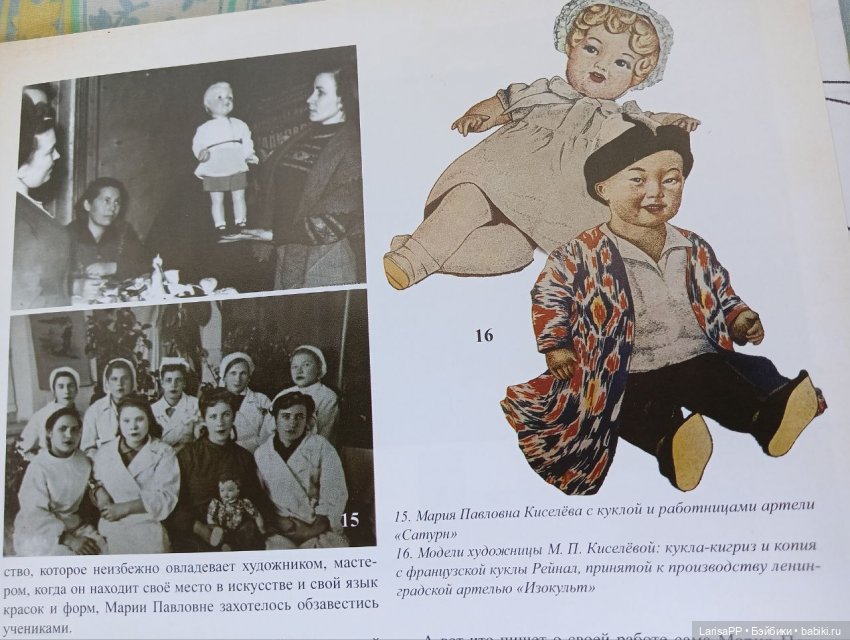Сам факт нахождения верхнего фото в журнале «Антикварная кукла» — удивительный и на данный момент непонятный. Скорее всего, ошибся журнал. Годы жизни М.П. Киселевой 1889-1954 (указаны в книге о Л. Сморгоне), а фото на сайте Мстёры датировано 60-ми годами. Я пересмотрела фото фабрики, эта же дама, в самом деле похожая на М.П., демонстрирует и другую продукцию, не только куклу в русском костюме. Очень жаль, но, похоже, что не она…