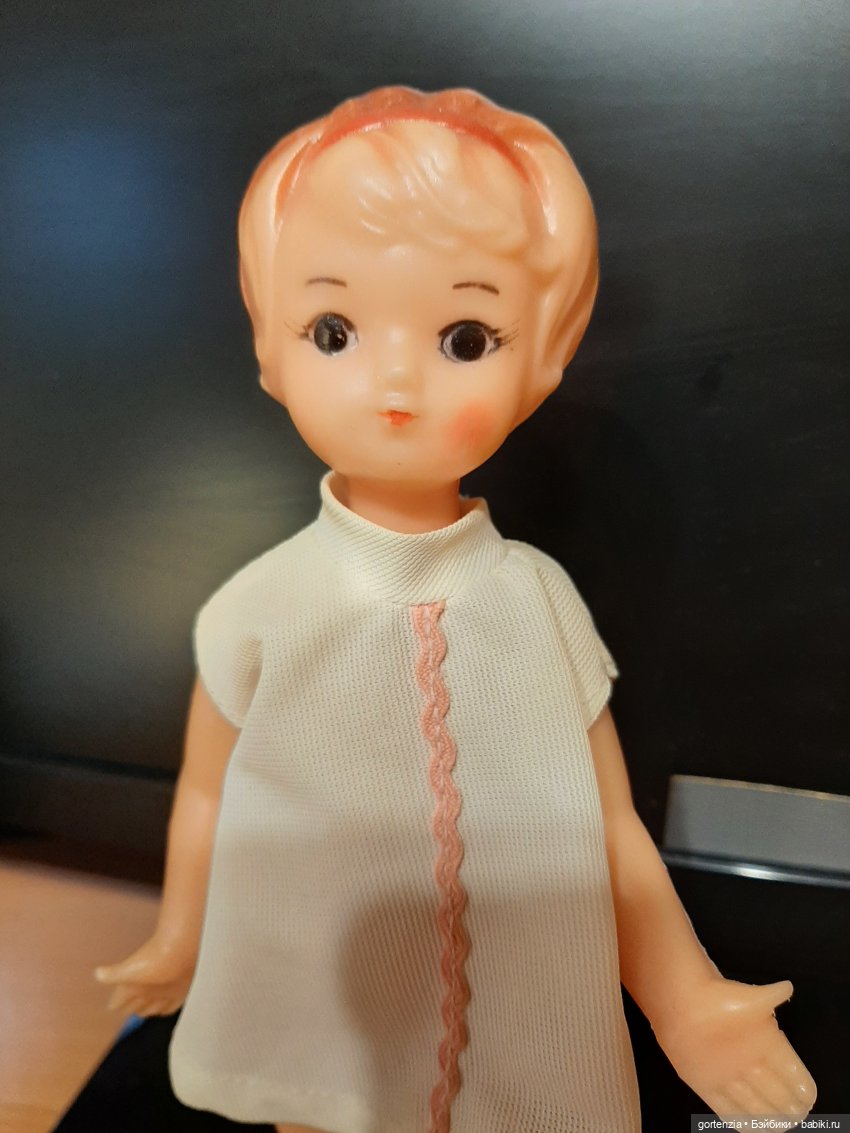 6. Шестая куколка поздняя, середина восьмидесятых как минимум. Сантиметров 19-25, с молдированными волосами, очень стройная, с подростковыми пропорциями, сильно похожа на вот эту, но по воспоминаниям стройнее.