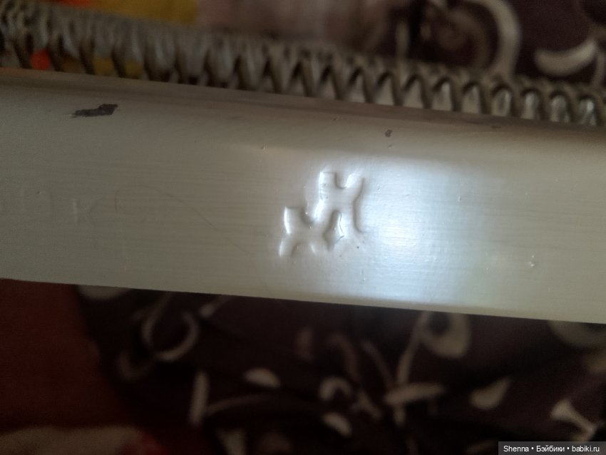 Да, цена и клеймо есть, без вашей подсказки не нашла бы — у этой кроватки менее контрастная окраска, букв и цифр почти не видно. Цена та же, а клеймо немного другое, больше похоже на две переплетённые Х-хромосомы, одна под другой, нижняя чуть левее. ))