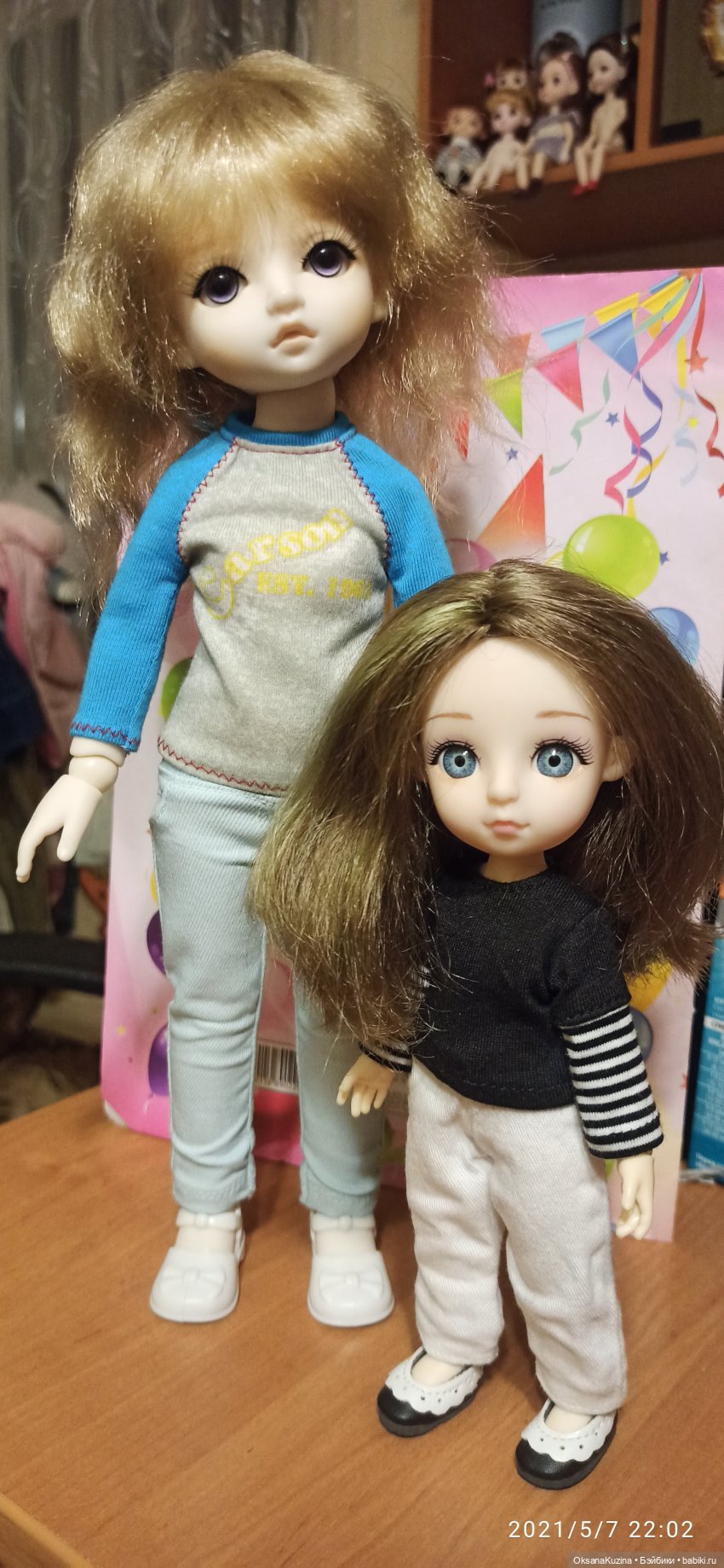 Здравствуйте, после выхода моего предыдущего топика меня попросили сравнить куколок малышек Doris и Monst. Думаю это сравнение может ещё кого нибудь заинтересовать. Сравнивала я Doris, заявленный производителем рост 22,5 см по мне так 23,5 и гибрид на теле мини Monst, рост моей малышки 19 см. Doris крупнее Monst. Шарниры более аккуратные и подвижные у Monst, особенно в руках у Doris не хватает поворота в локтях, а кисти вообще без шарниров. И Doris совершенно не сидит самостоятельно, угол спины и бедер больше 90 градусов и поэтому кукла заваливается на спину. Моя малышка гибрид с более мелкой головой чем фабричная Monst поэтому она очень устойчивая, а вообще из-за большой головы Монстиков тоже иногда тяжело выставить в позу. У Doris тельце смотрится более малышовым из-за укороченных ножек и крупной головы и безумно притягательного наивного взгляда огромных глаз. Обе куколки прекрасны, у каждой есть своя изюминка.